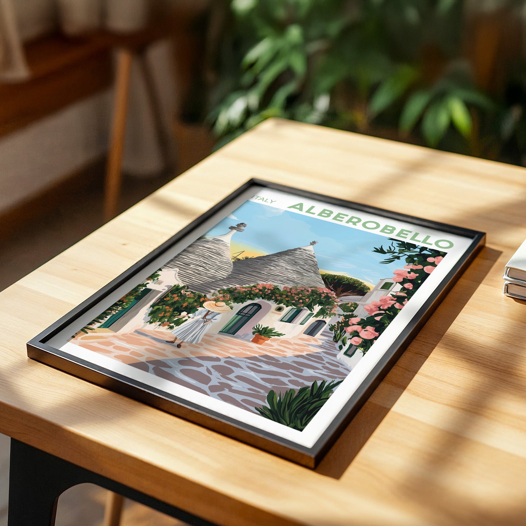 Celebrate the charm of southern Italy with this delightful Alberobello poster. This Italy art print captures the picturesque whitewashed trulli houses with their cone-shaped roofs, set against the warm Apulian sunshine and cobbled streets lined with flowers.