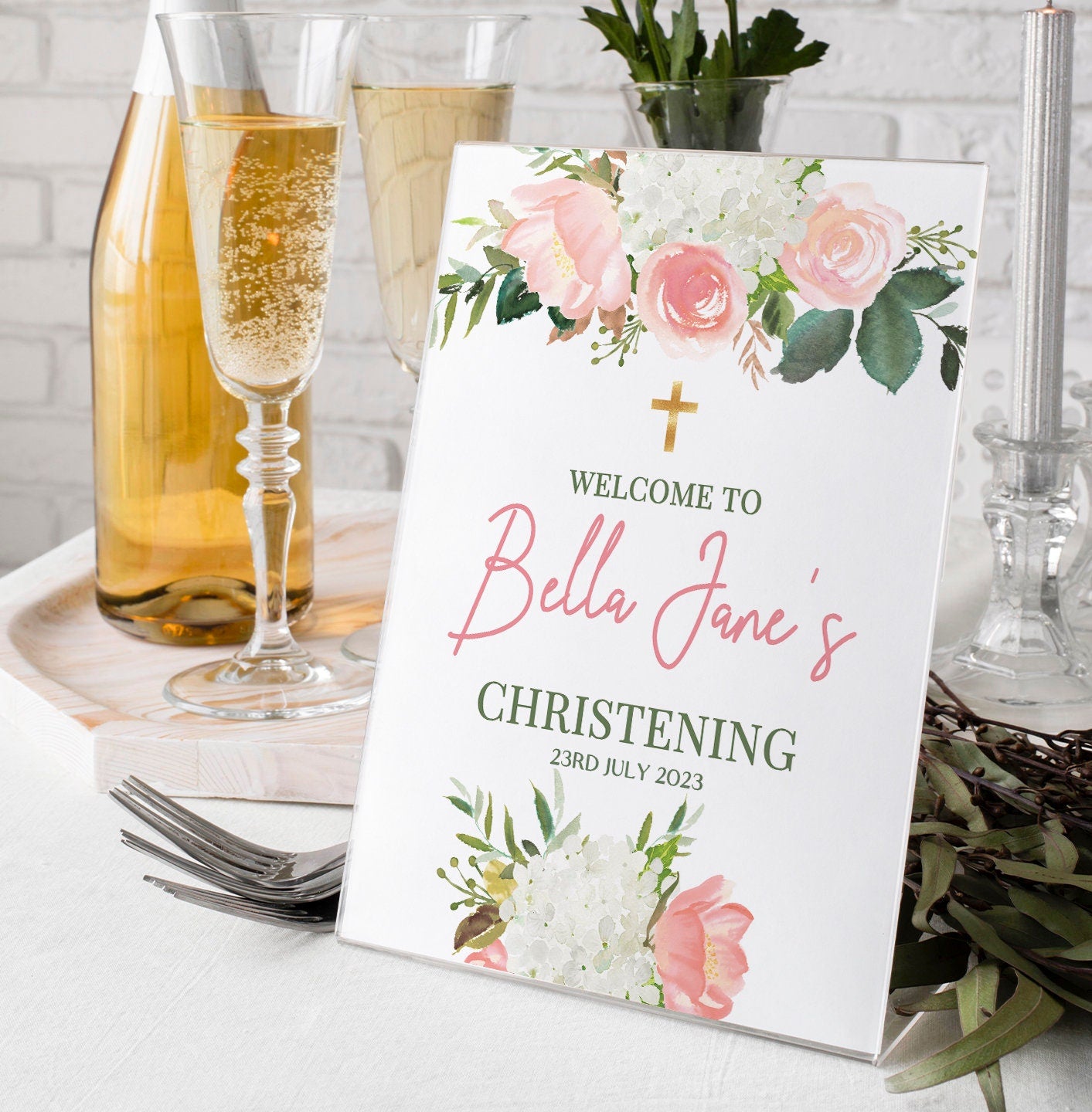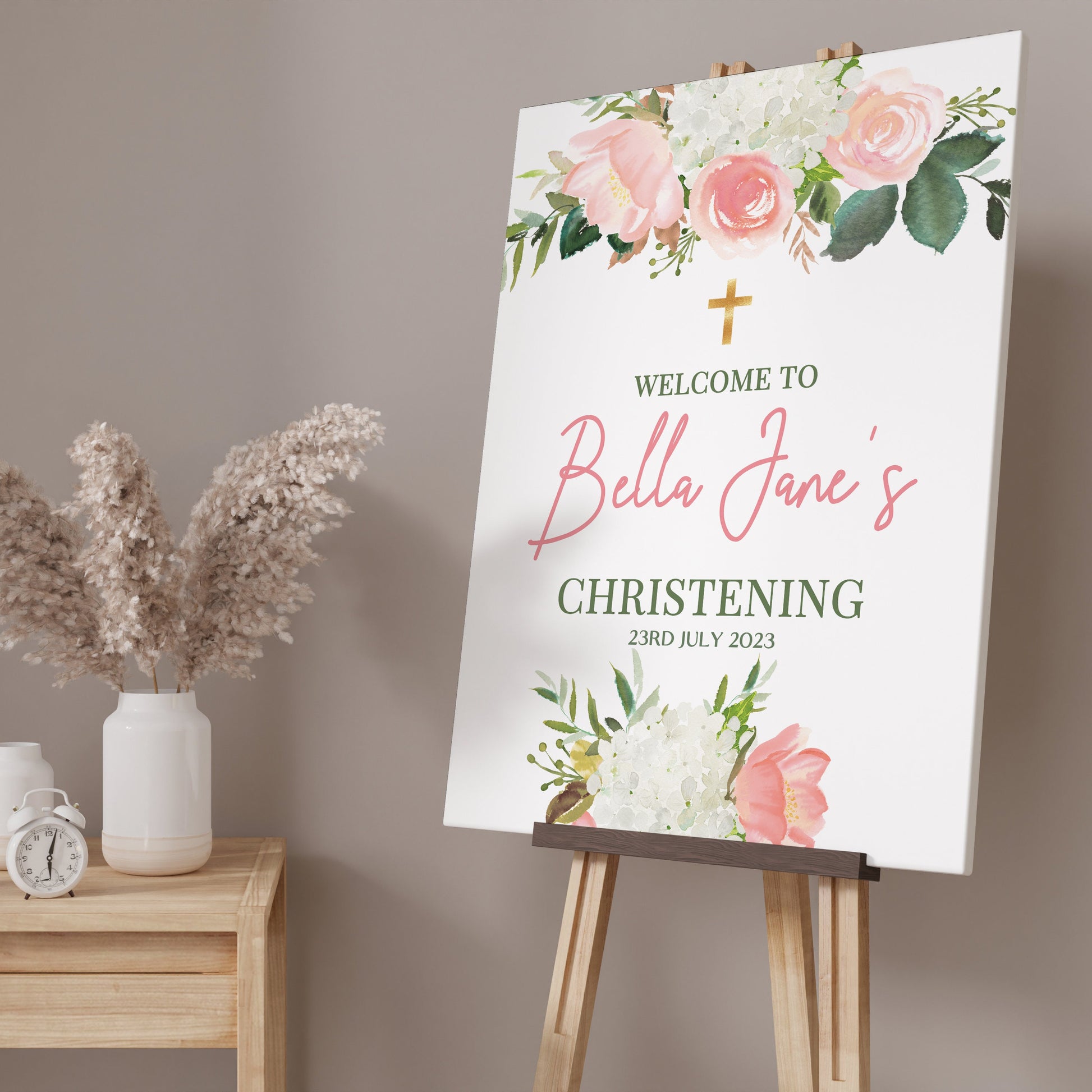 Capture a momentous Christening Day with this Blush Pink Floral Christening Welcome Sign. Our pink roses welcome sign will create an exceptional way to welcome guests, document the special day, and celebrate this wonderful occasion.