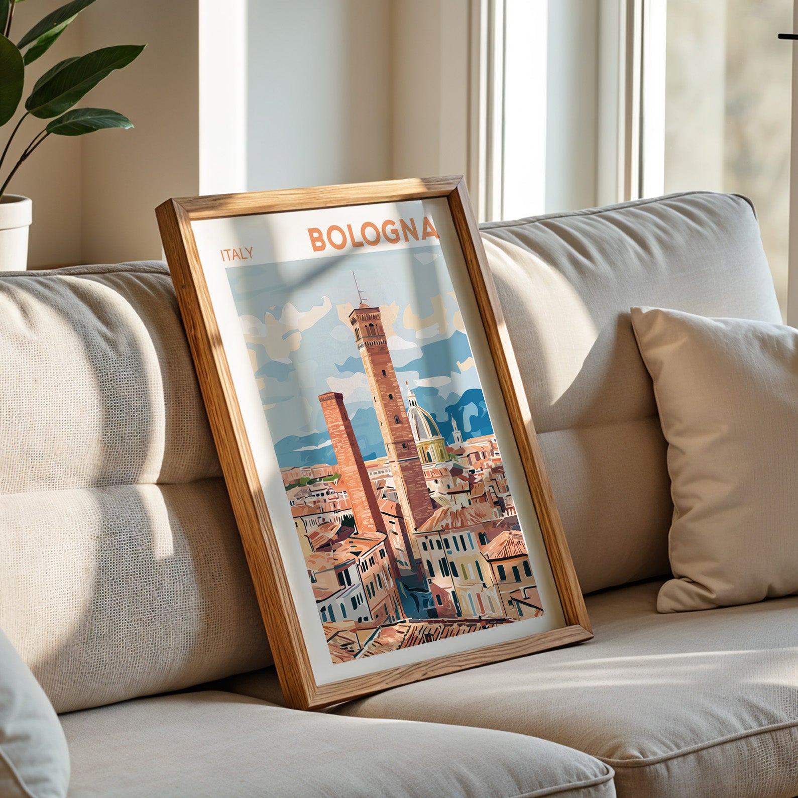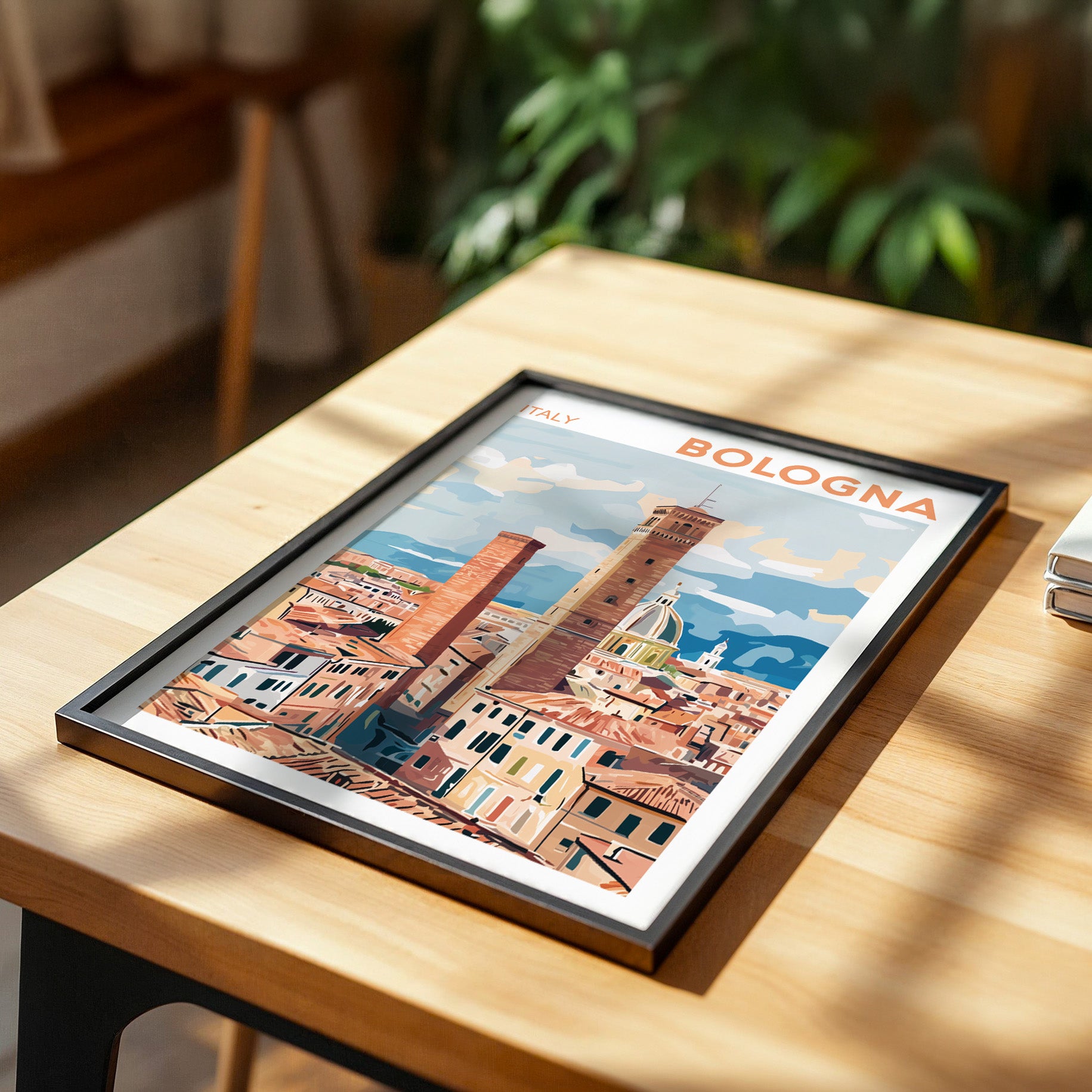 Ideal for lovers of Italy, historic cities, and travel posters, this print evokes the inviting atmosphere of Bologna — a city where tradition and creativity meet.