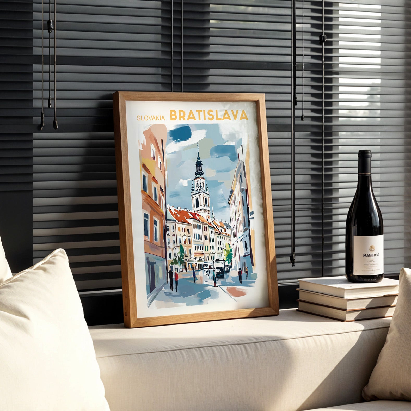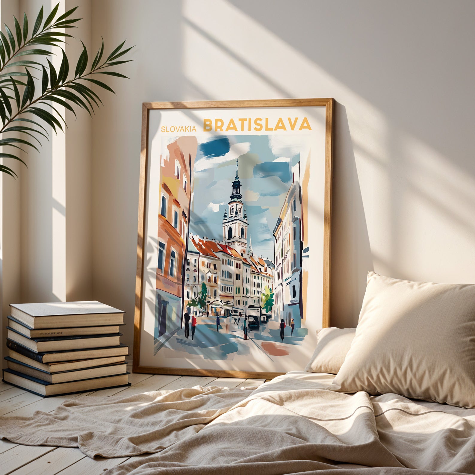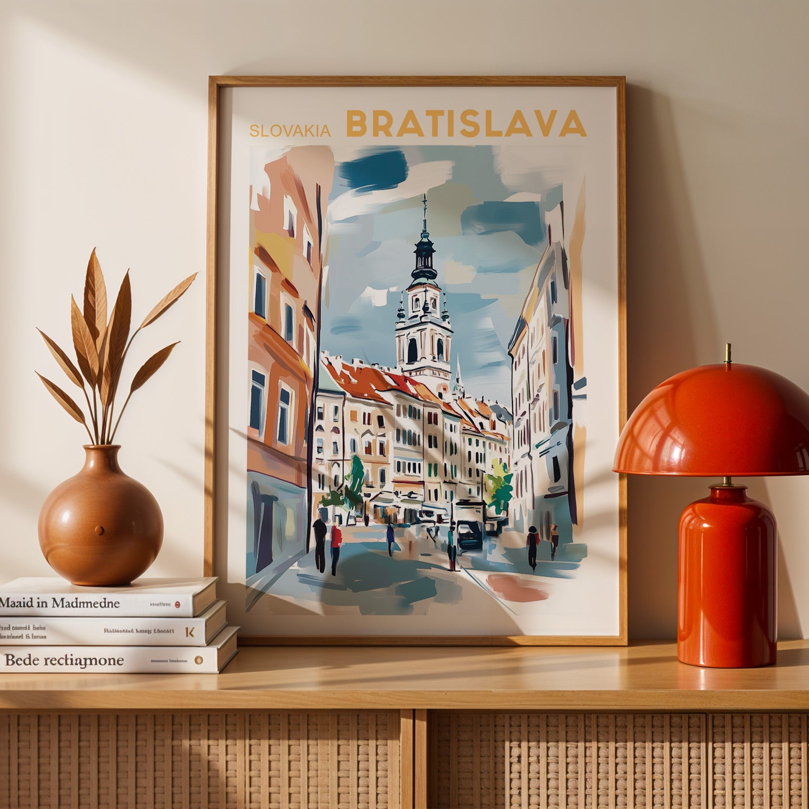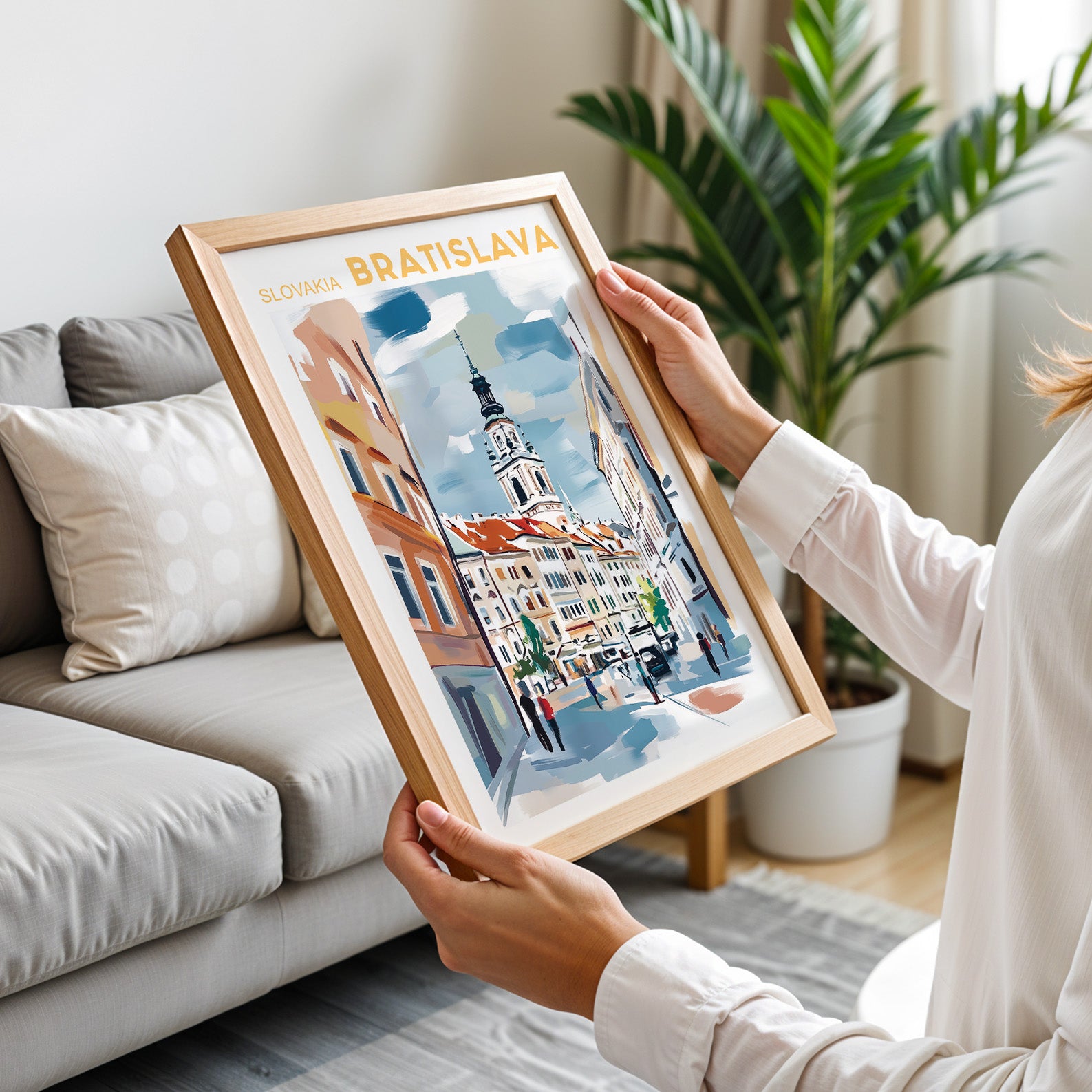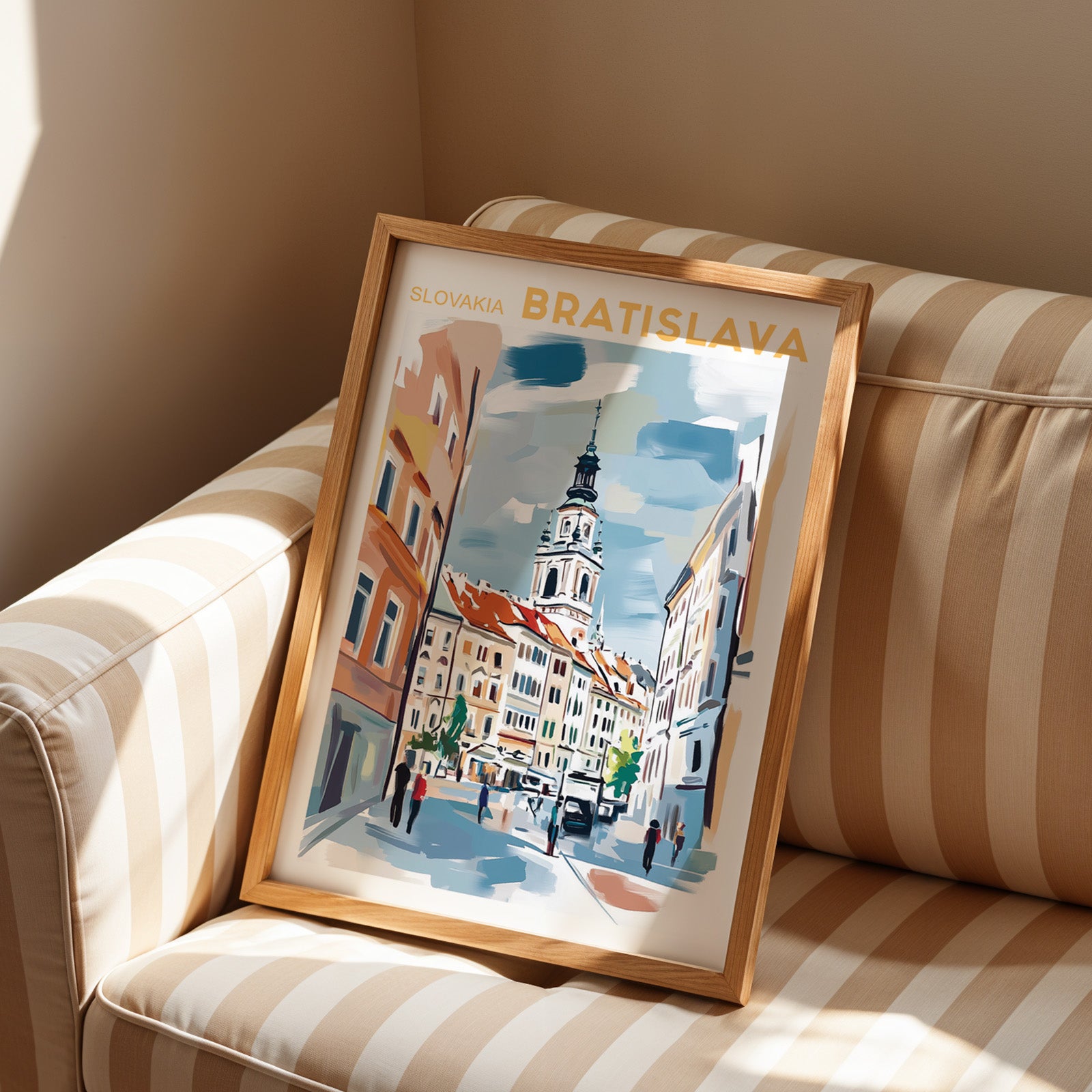 Illustrated in a soft painterly style, this Bratislava wall art evokes calm, colour, and old-world beauty — perfect for adding European warmth to a living room, study, or hallway.