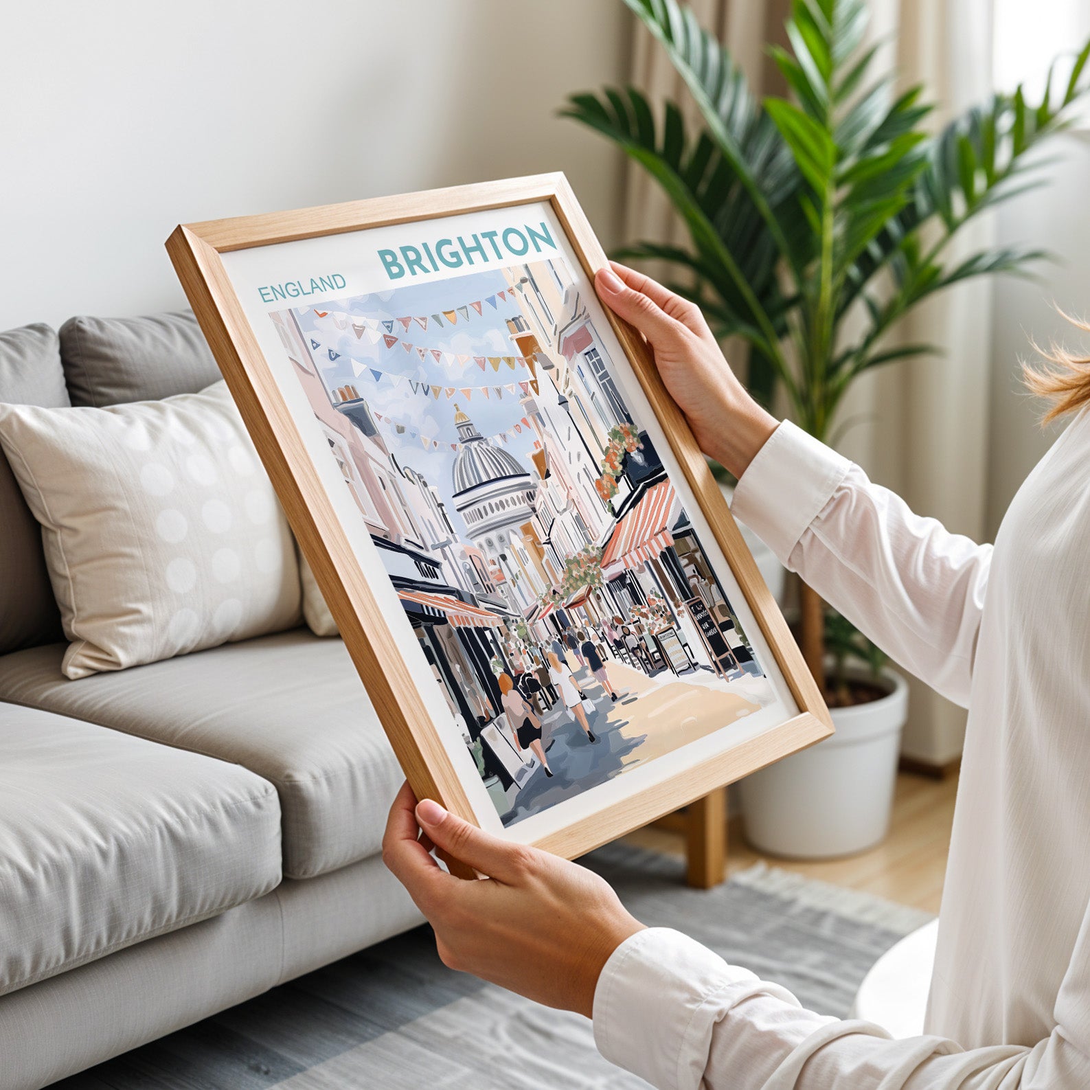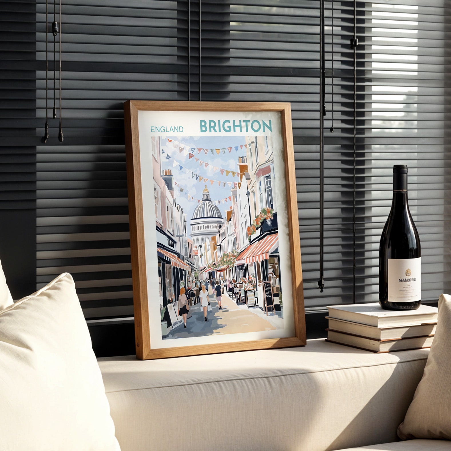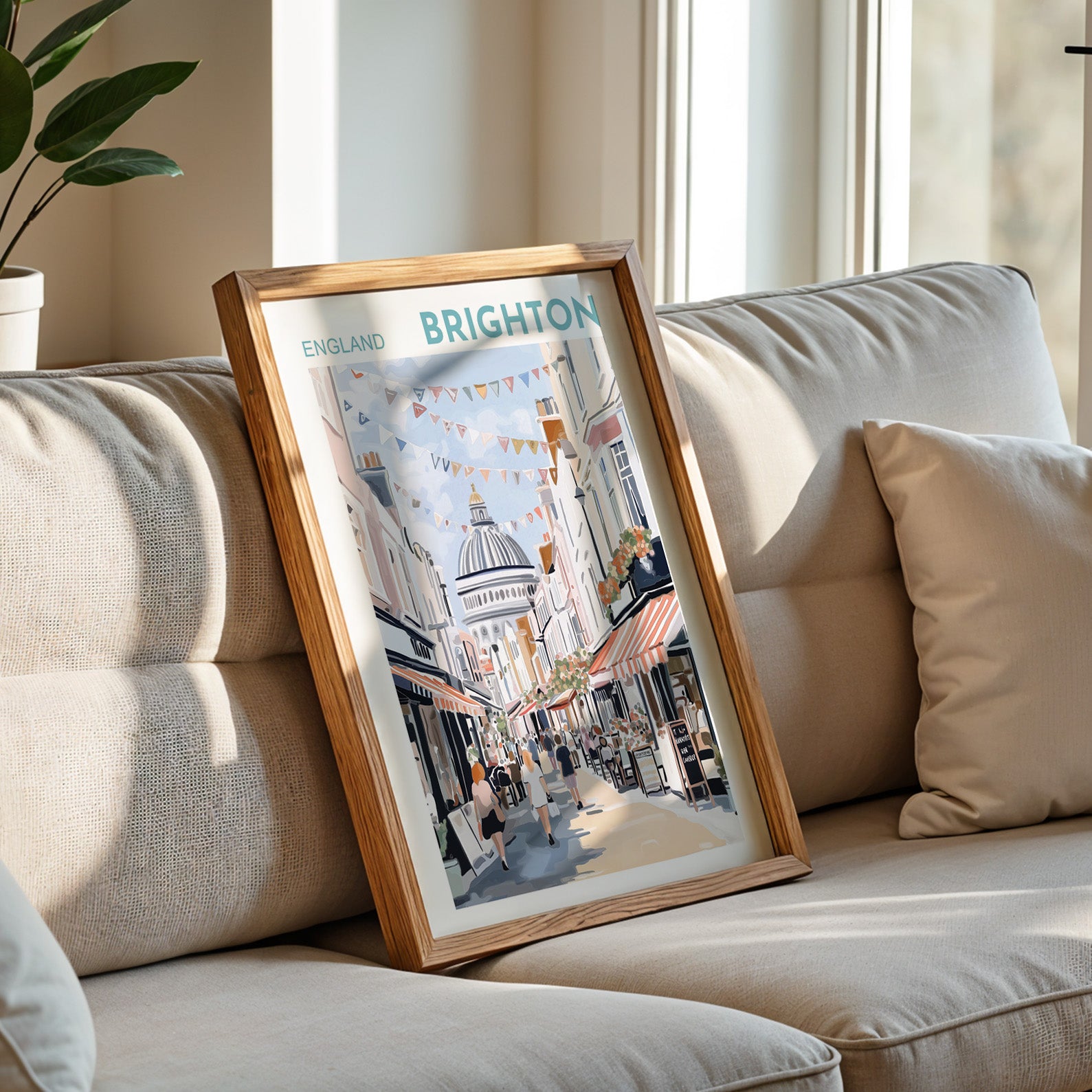 Bring the charm of England’s seaside city into your home with this vibrant Brighton Lanes poster. Featuring the iconic view of The Lanes, one of Brighton’s most beloved areas, this artwork captures the lively atmosphere of boutique shops, cafés, and colourful bunting under a bright summer sky.