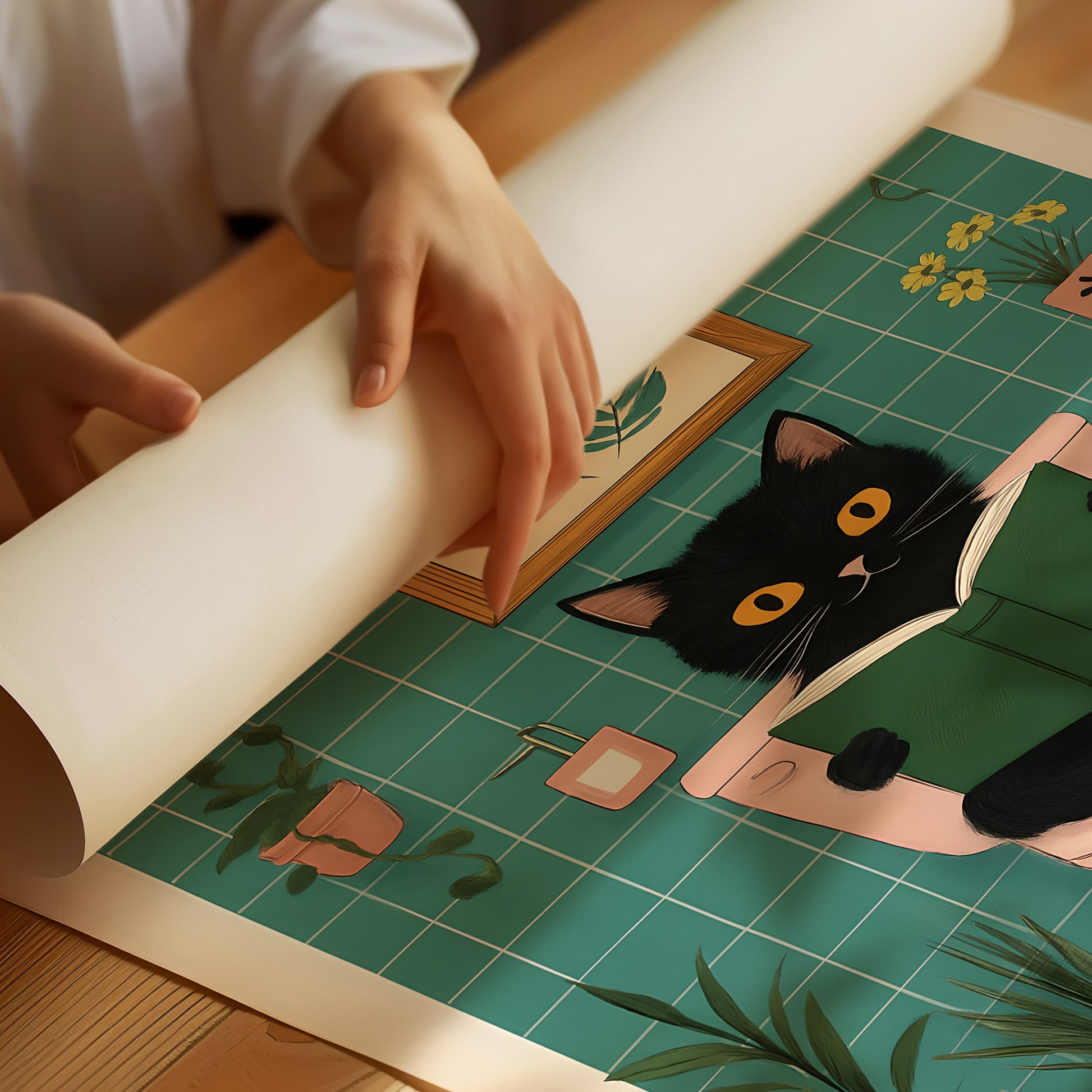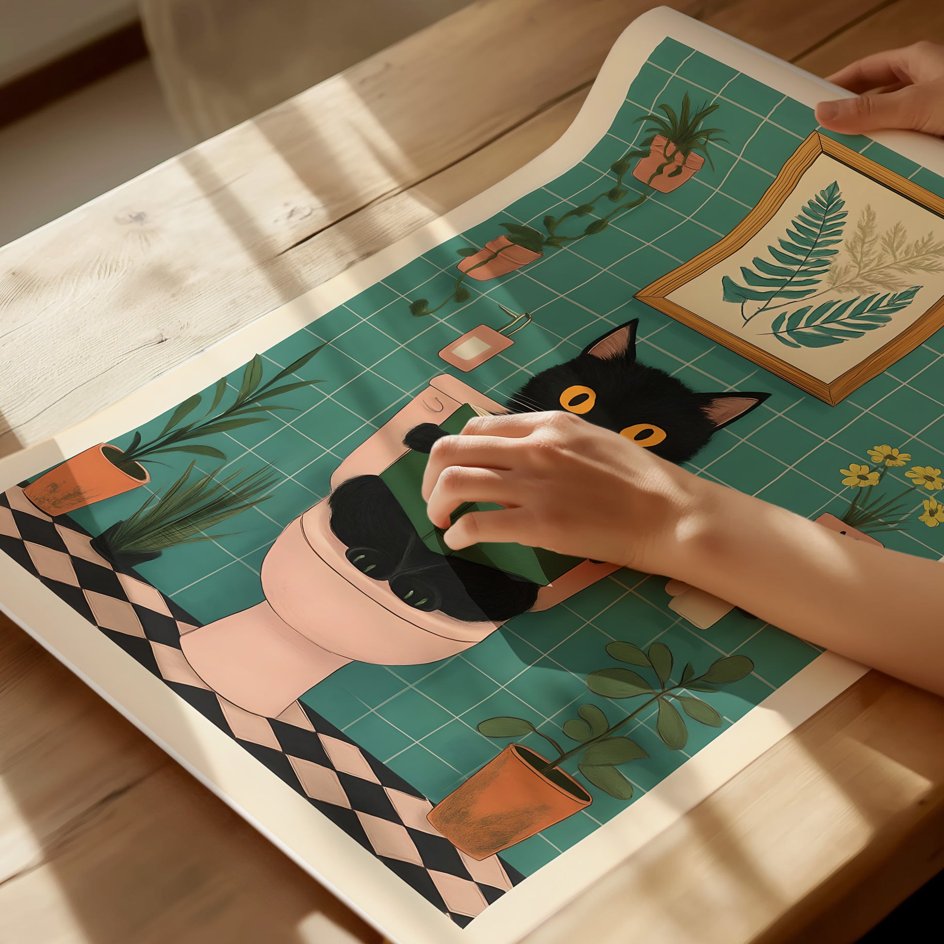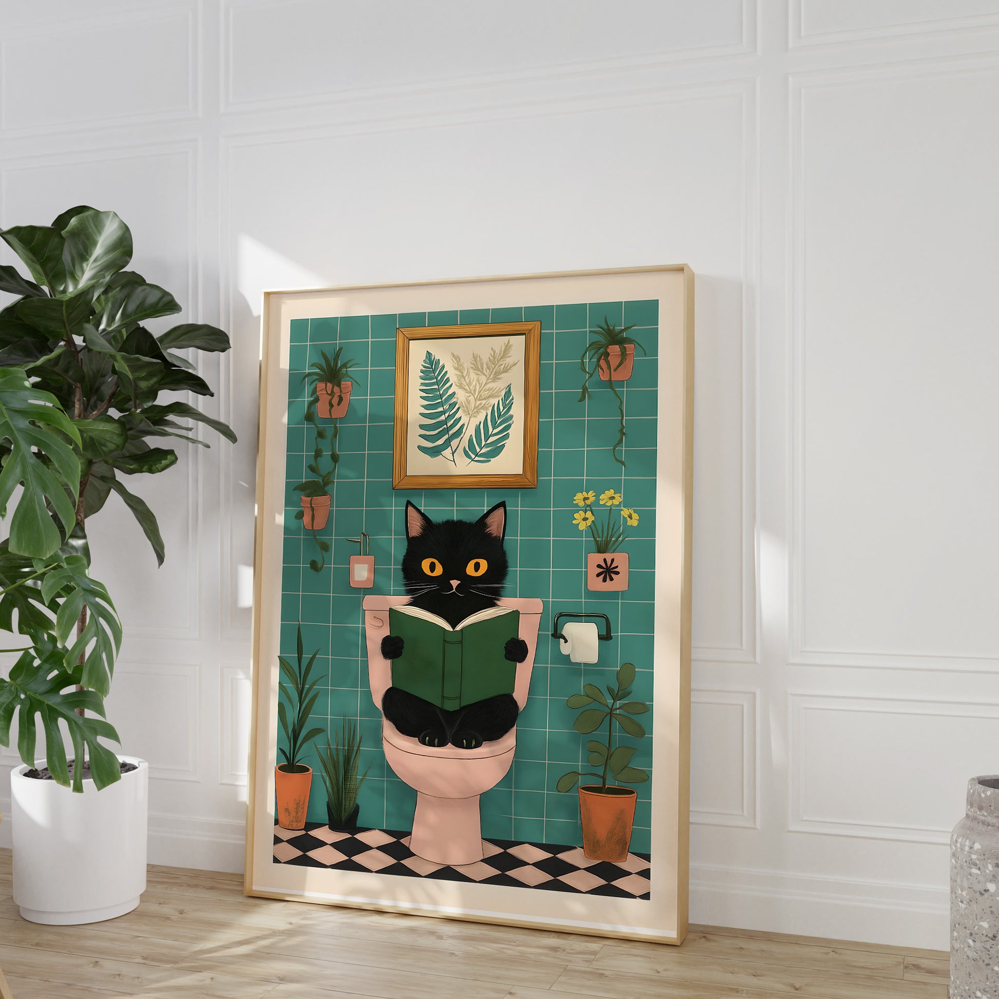 Add some humor and charm to your bathroom (or anywhere, really) with this “Cat on the Toilet” art print. Featuring a black cat calmly reading a book on a pastel toilet surrounded by plants, this poster is equal parts cozy and comical.