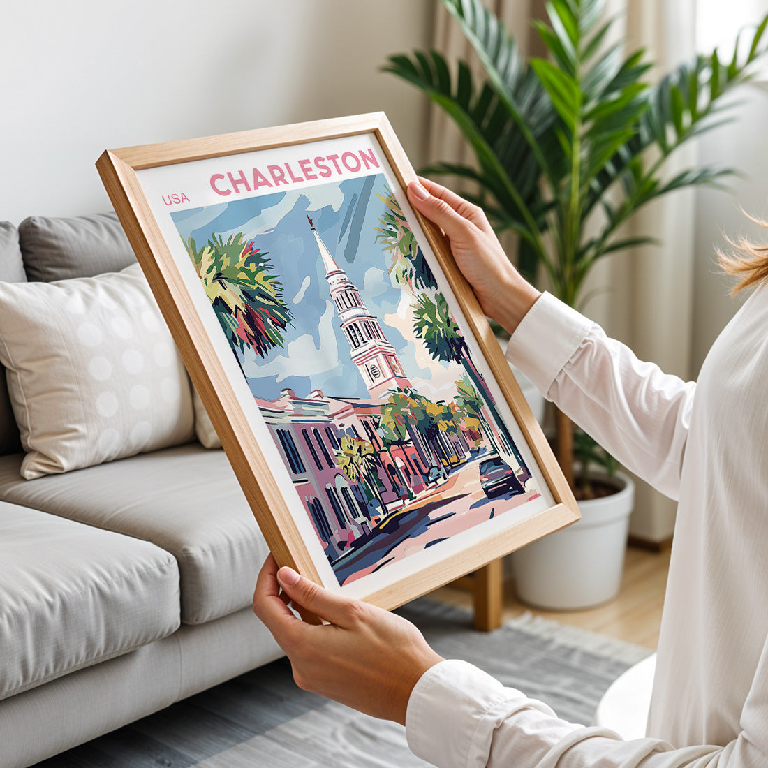Bring southern charm and pastel beauty to your home with this elegant Charleston poster. This USA travel art print captures the city’s colourful historic houses, cobbled streets, and blooming trees under soft coastal light.
