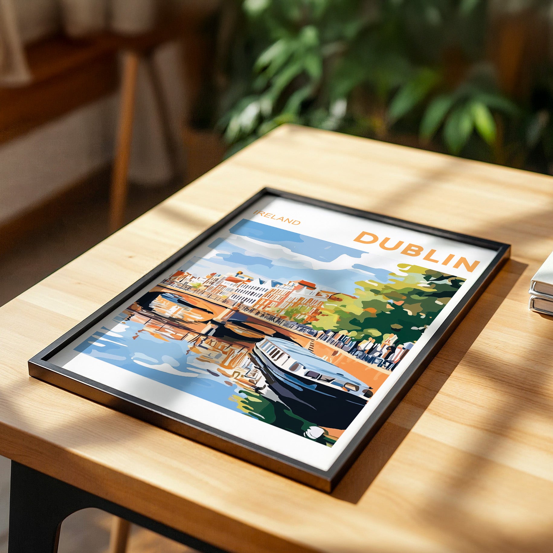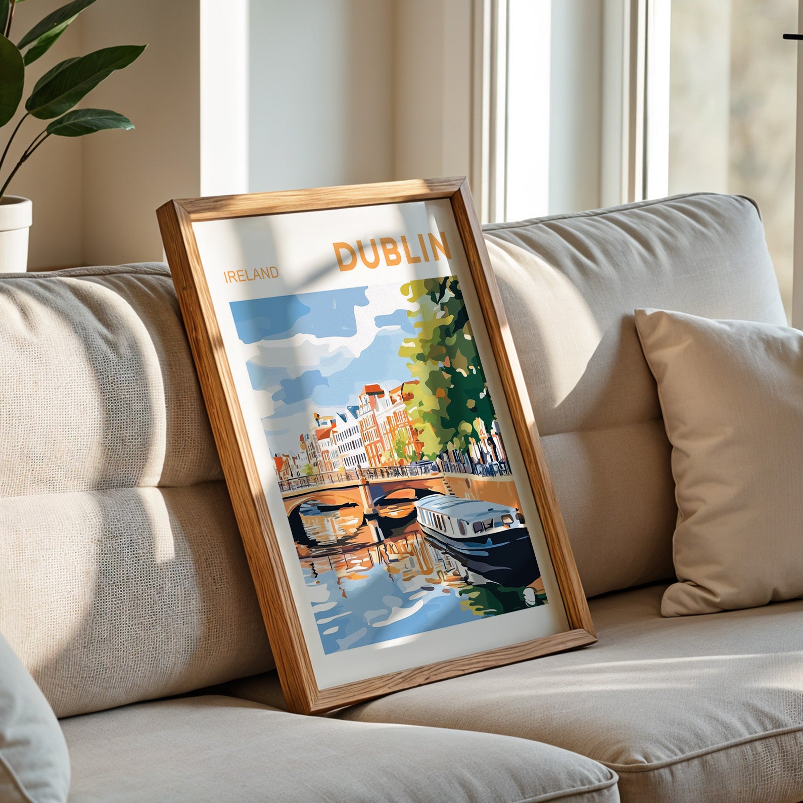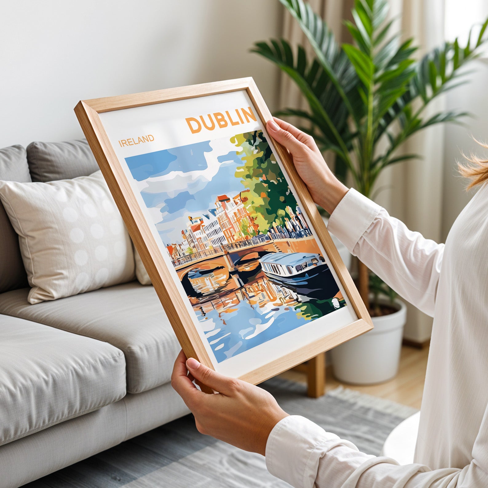 Celebrate the charm of Ireland’s capital with this beautiful Dublin poster. This Dublin art print captures the colourful Georgian architecture and calm reflections along the River Liffey, complete with the city’s iconic bridges and warm Irish light.