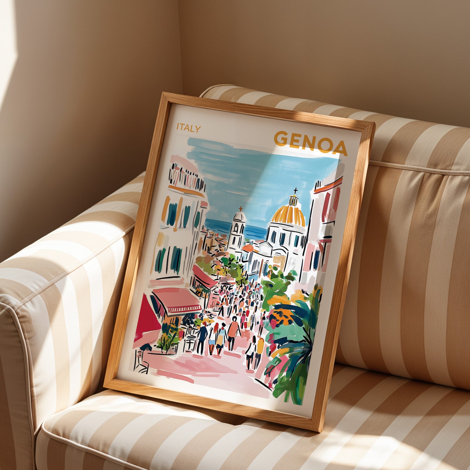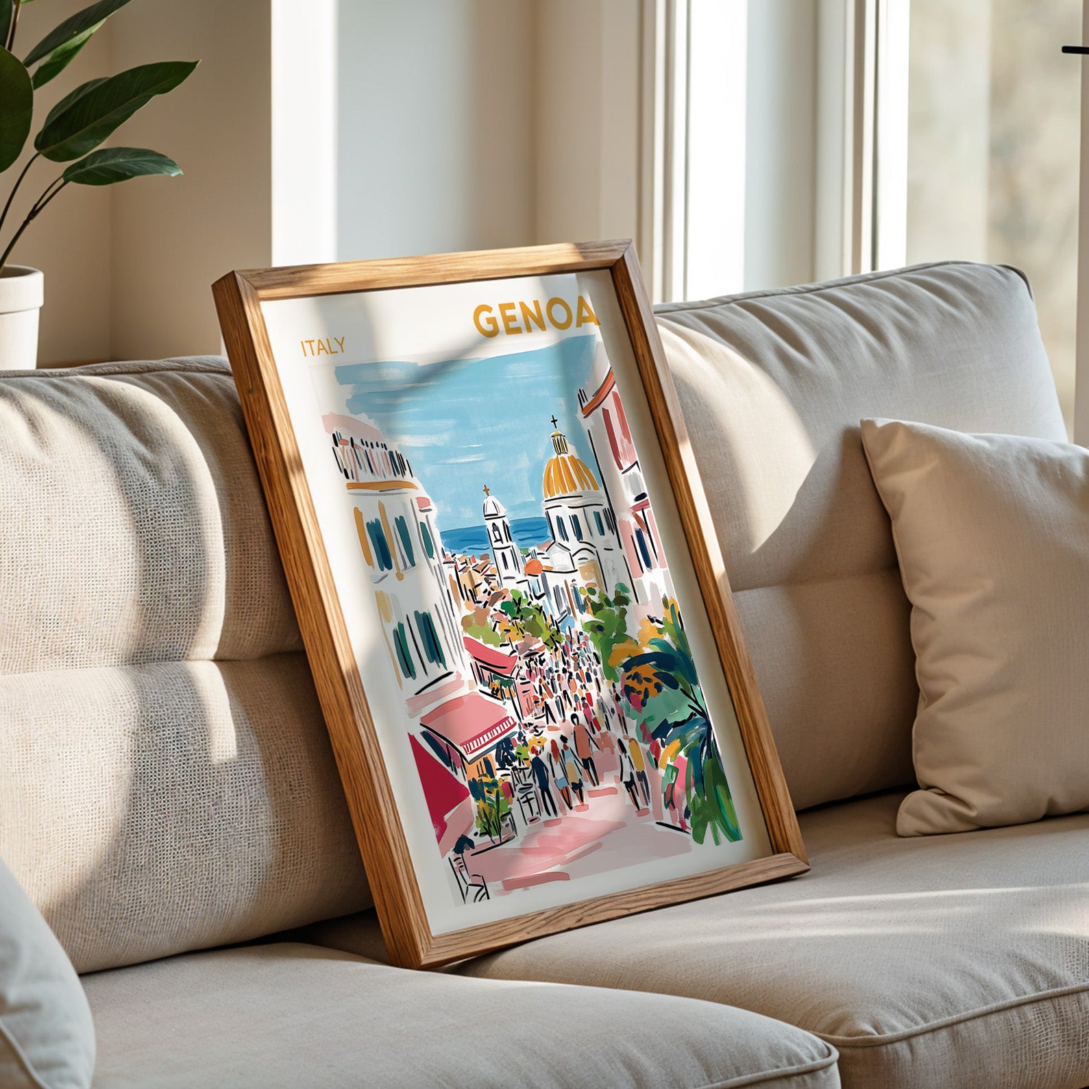 Ideal for lovers of Italy, historic port cities, and travel posters, this print brings the character and colour of Genoa’s beautiful coastline to your décor.
