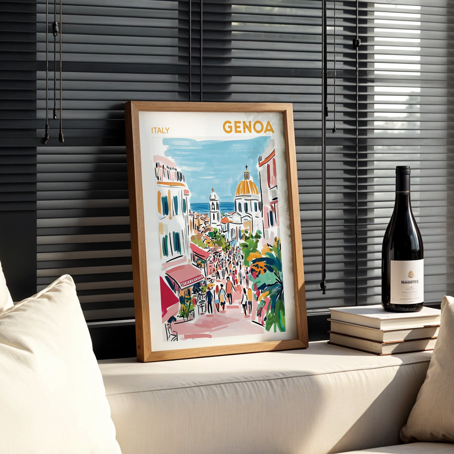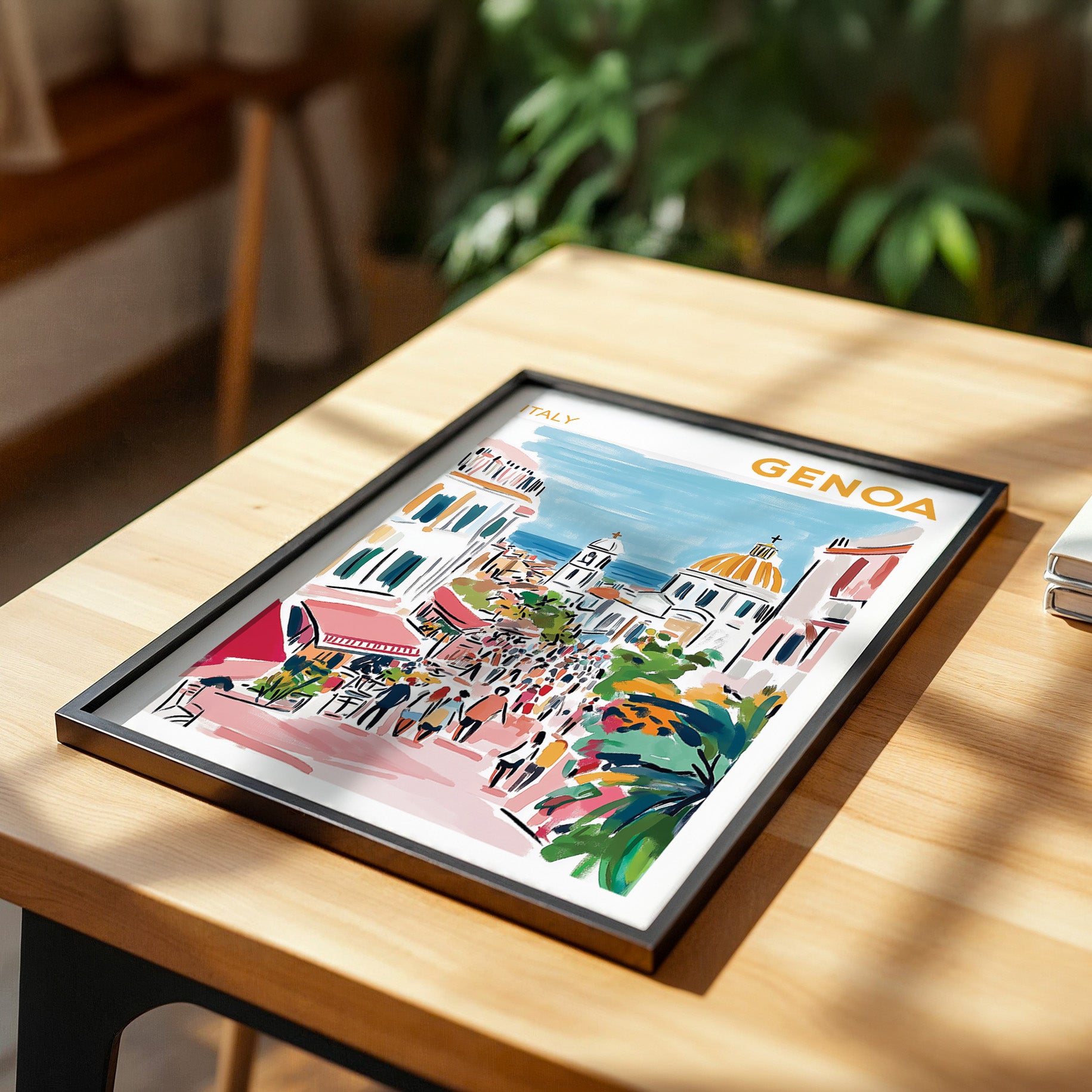 Celebrate the spirit of the Ligurian coast with this striking Genoa poster. This Italy art print captures the vibrant harbour, colourful hillside buildings, and the maritime charm that has defined Genoa for centuries.