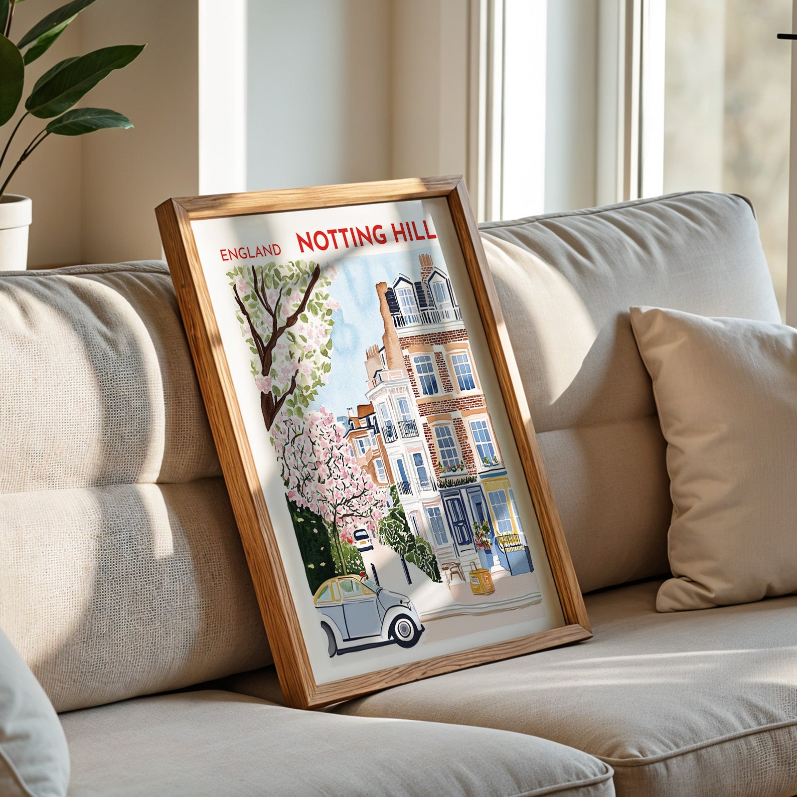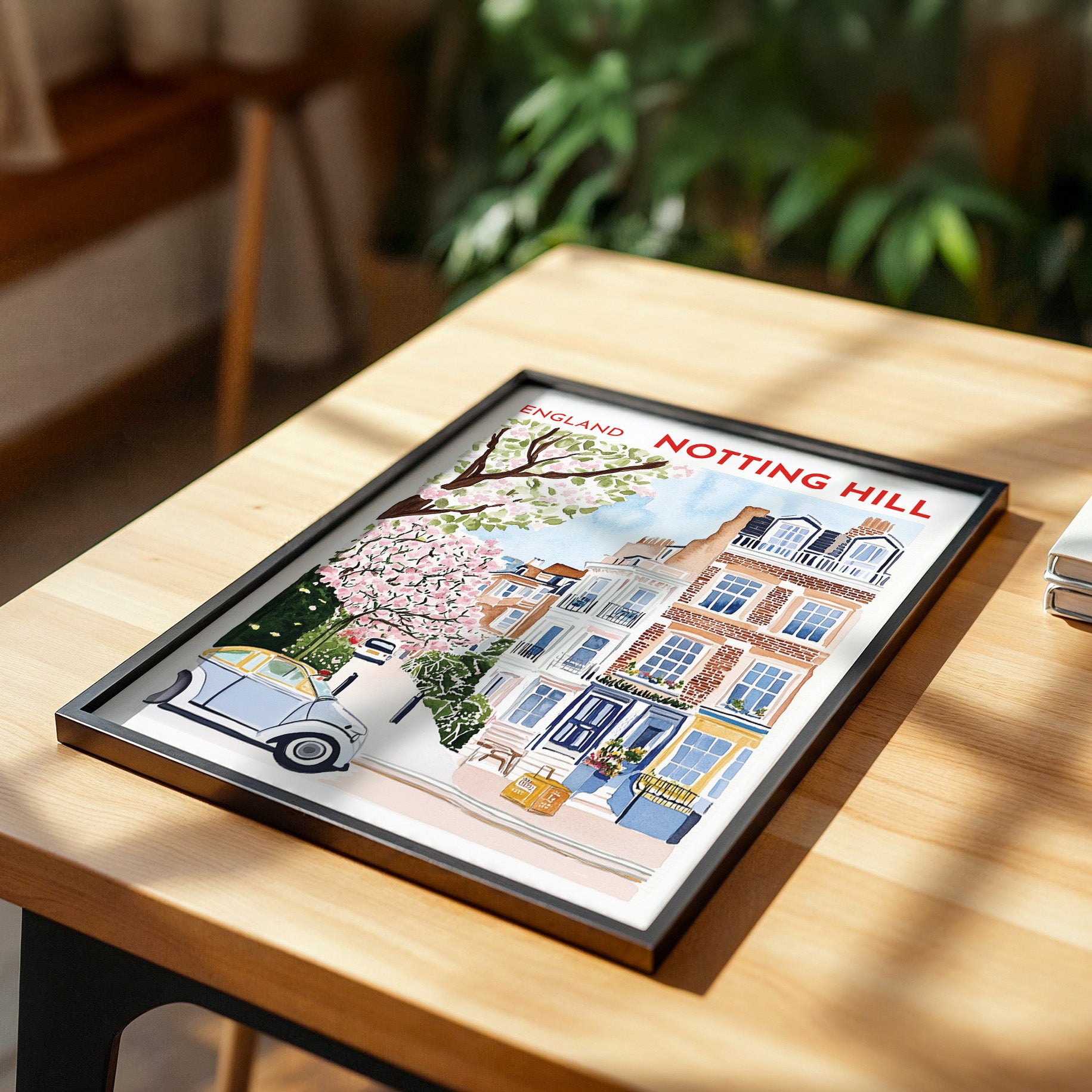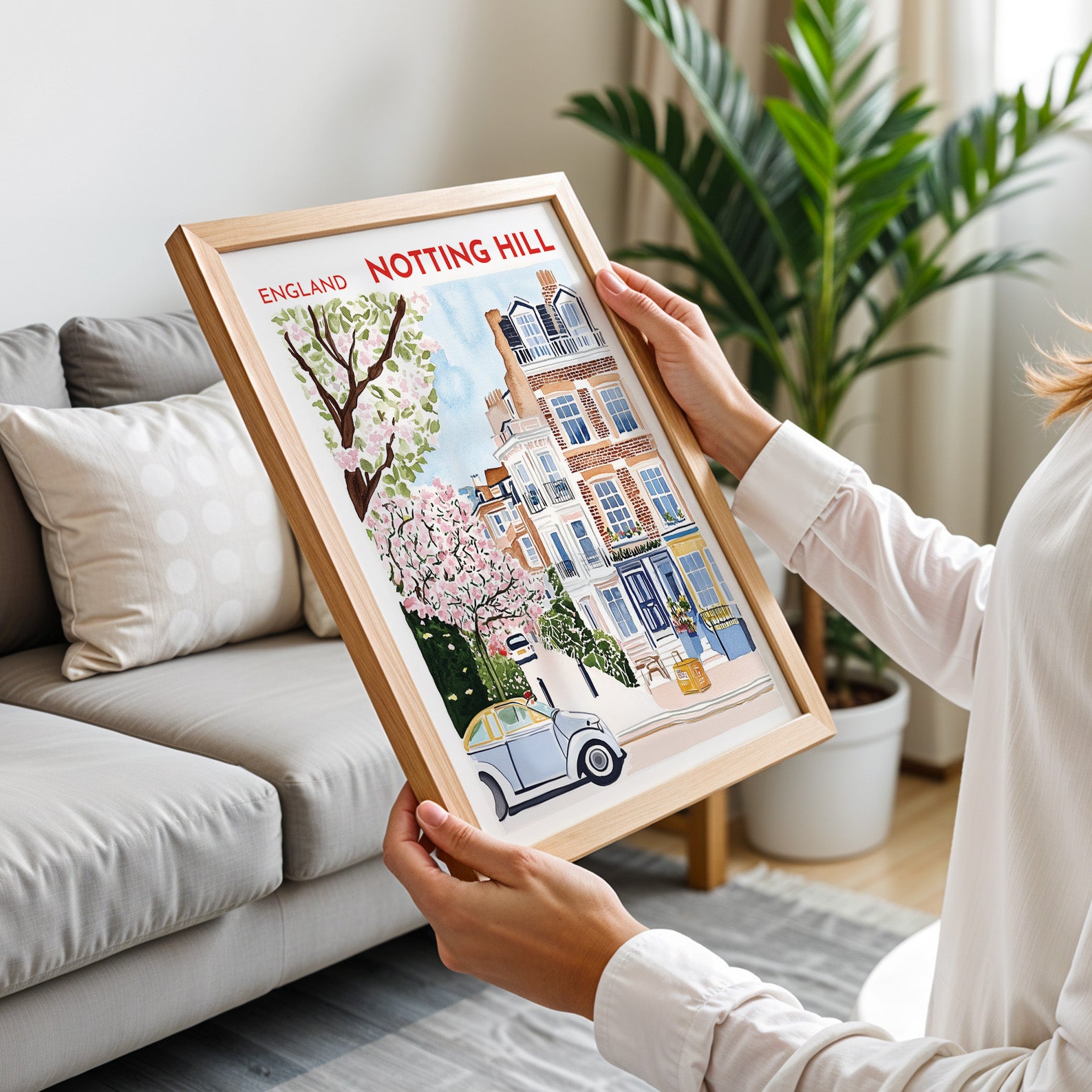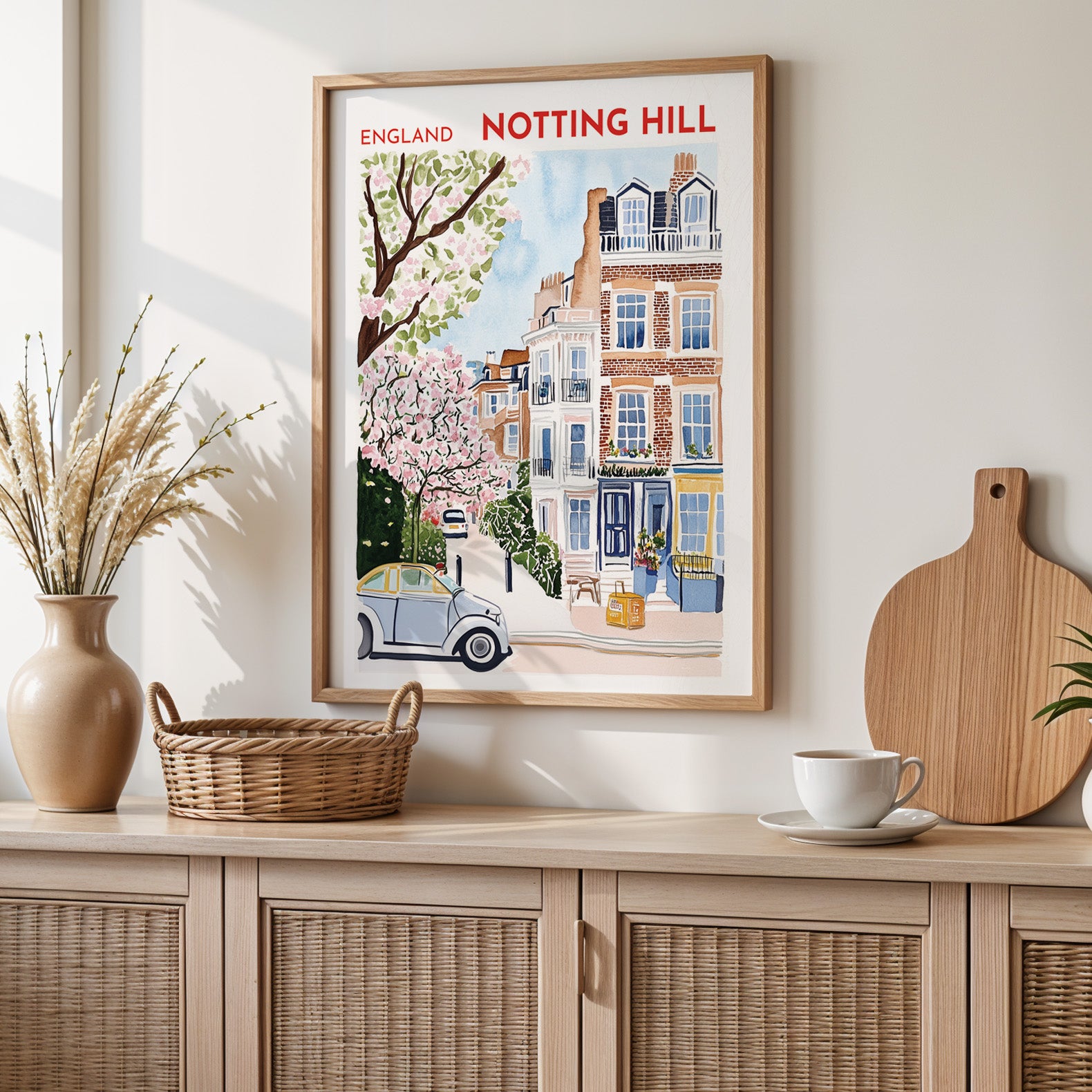 Bring a touch of London charm to your home with this delightful Notting Hill poster. This London art print captures one of the city’s most picturesque neighbourhoods, featuring pastel townhouses, cherry blossoms in full bloom, and a vintage car parked along a quiet, tree-lined street.
