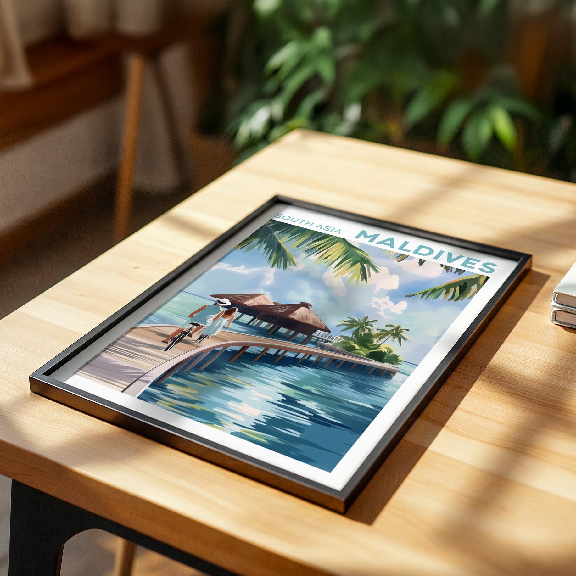 Escape to paradise with this serene Maldives poster. This travel wall art print captures the beauty of crystal-clear waters, white sandy beaches, and palm-fringed islands beneath soft turquoise skies.