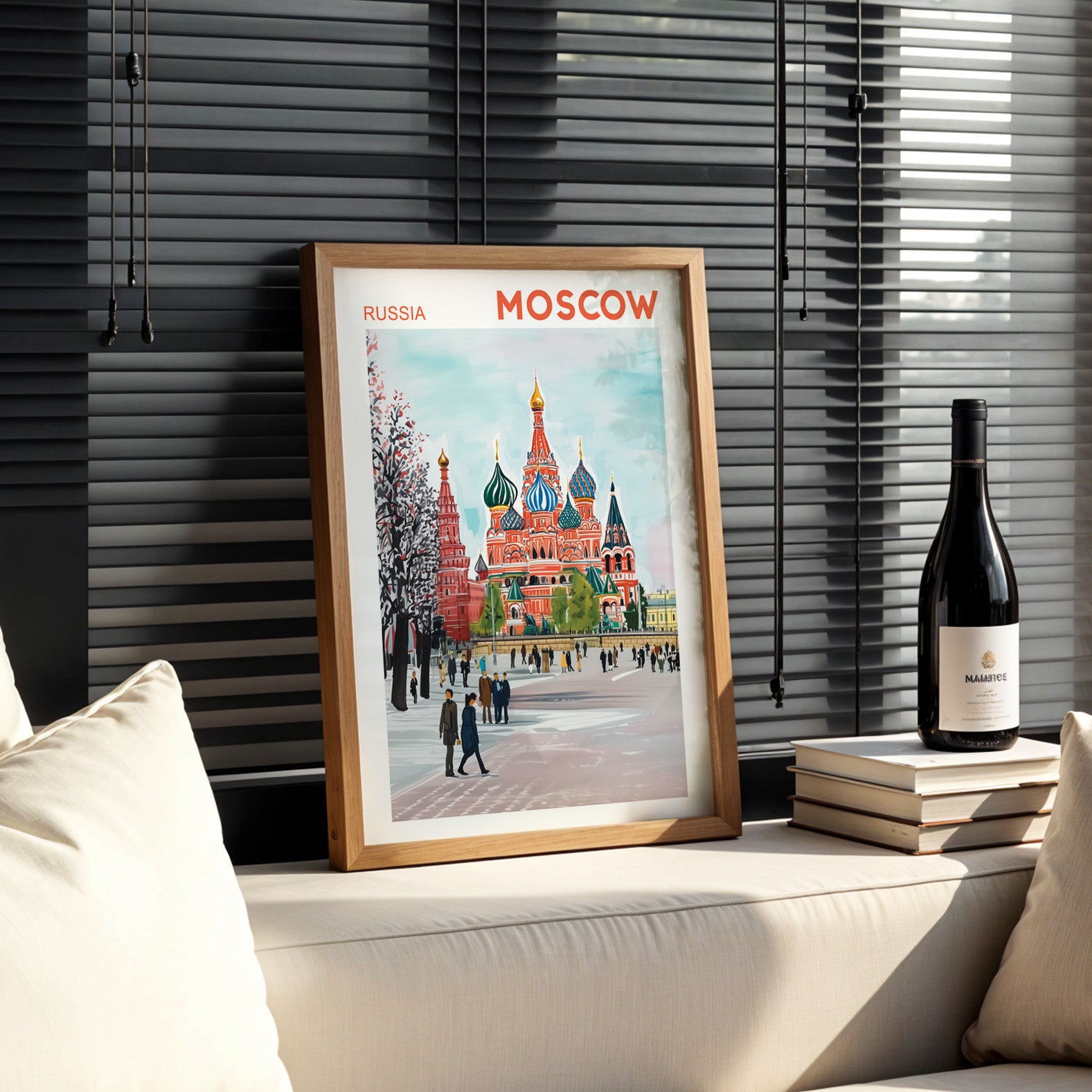 Illustrated in a detailed painterly style, this Moscow wall art adds richness and sophistication to your living room, office, or study.