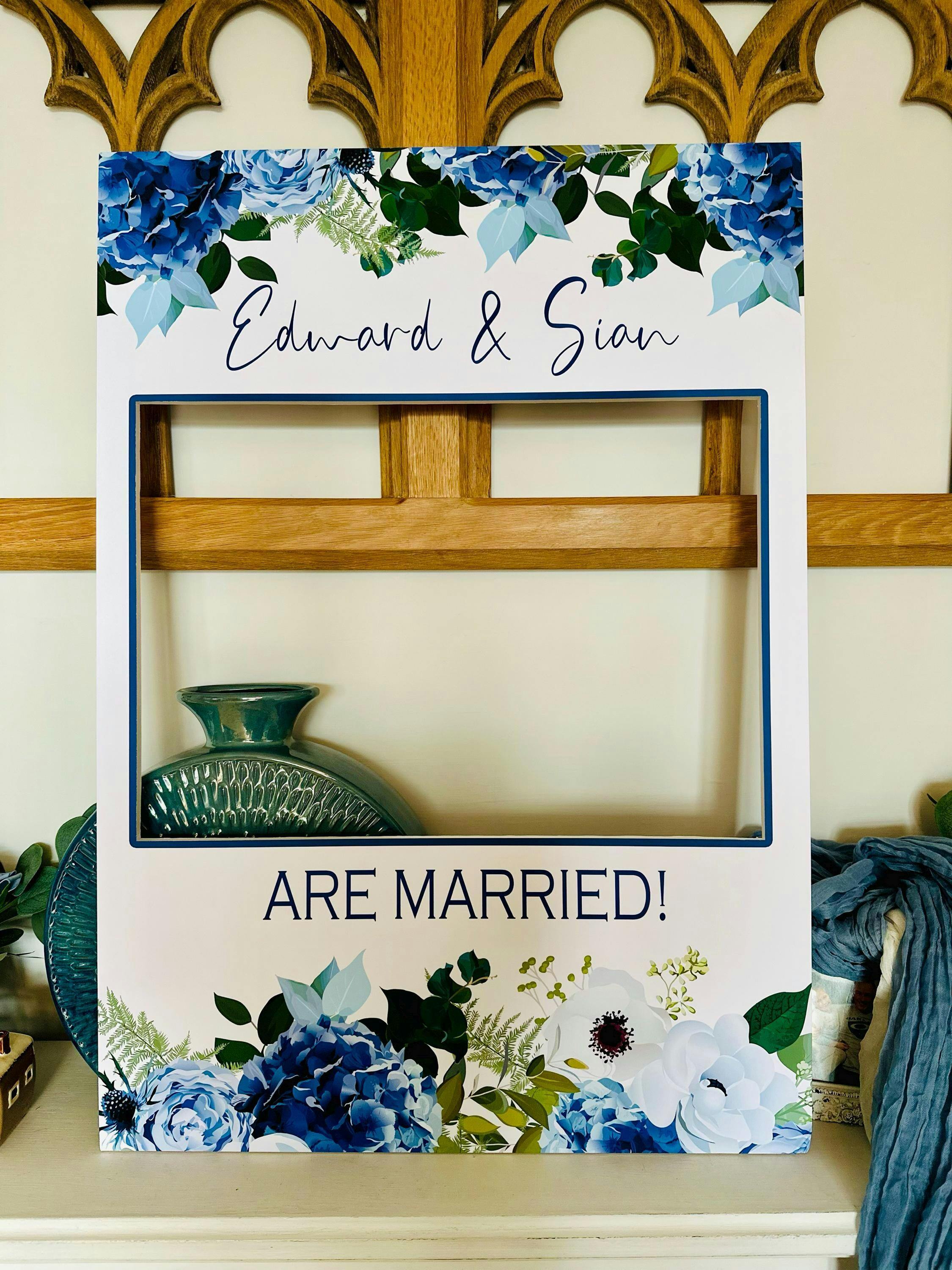 The beautiful navy and white wedding selfie frame is perfect for your upcoming wedding day. This floral photobooth frame ticks all of the boxes for a fun wedding night and will provide a fantastic photo opportunity for the Bride, Groom and guests!