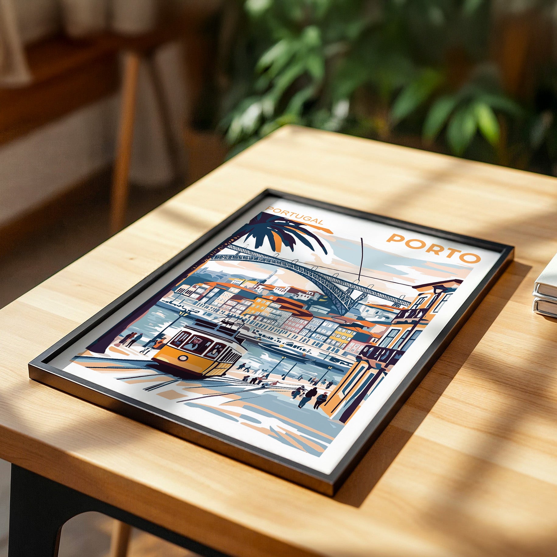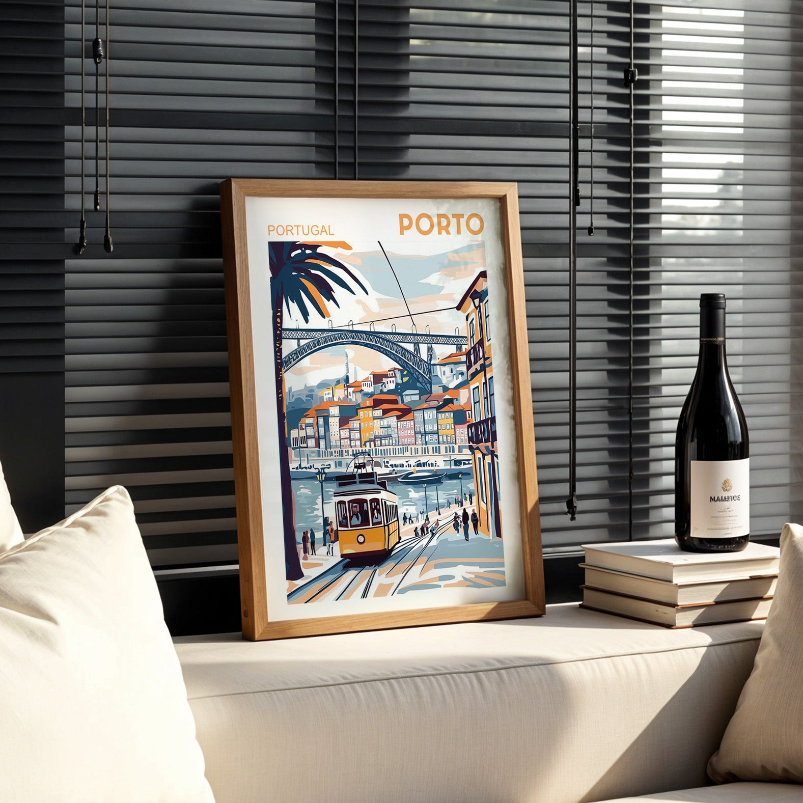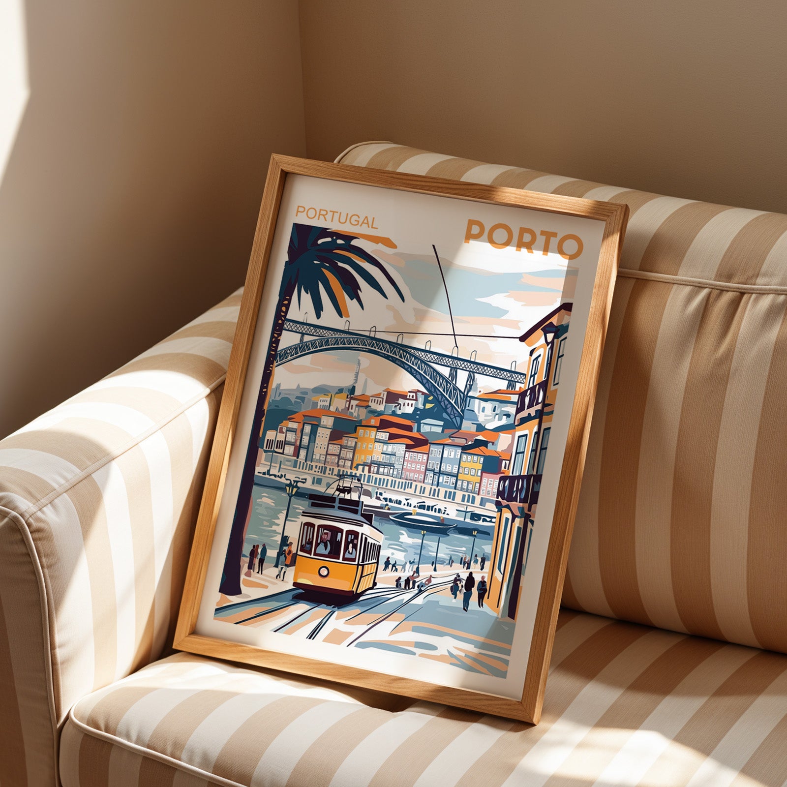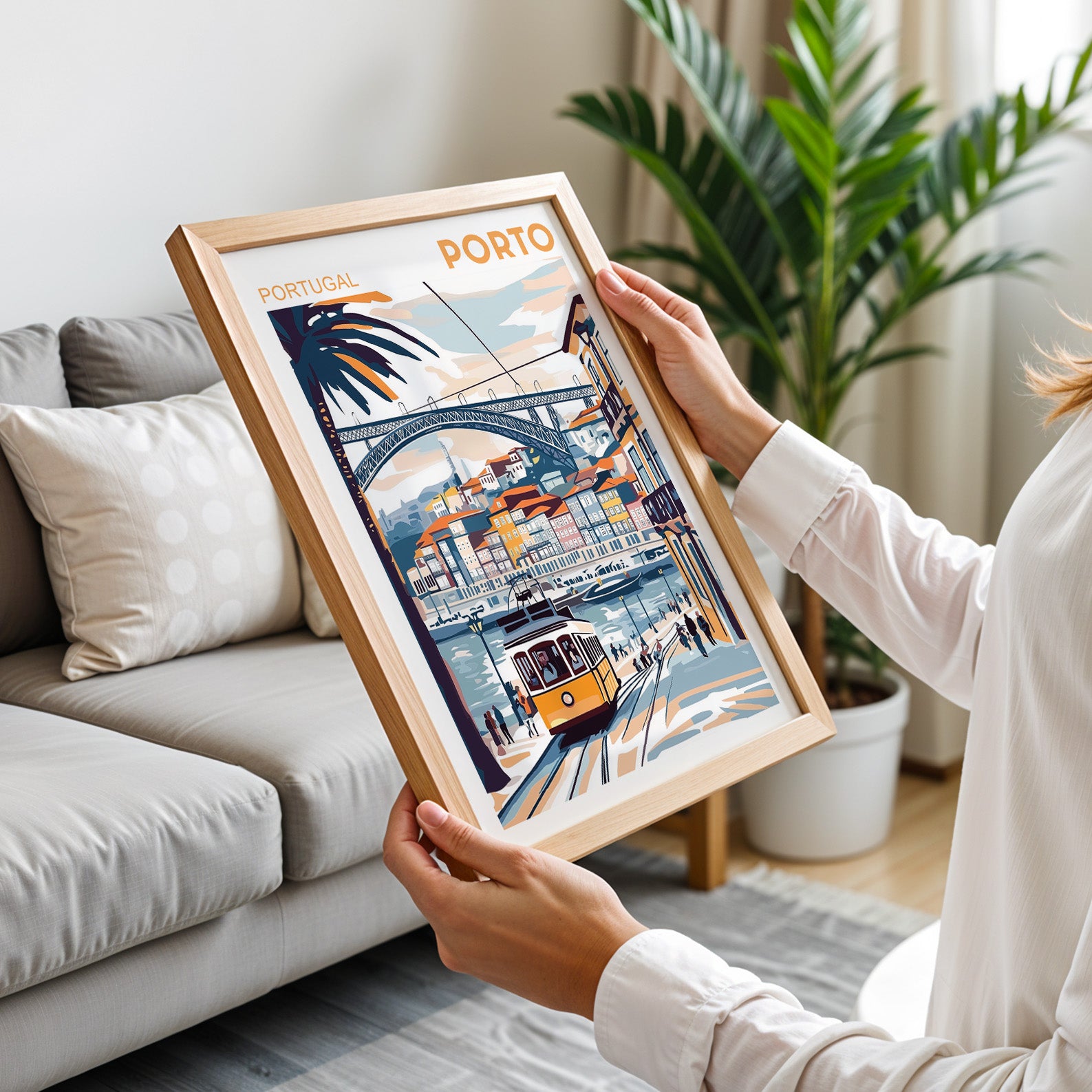 Celebrate the charm of Portugal’s northern coast with this elegant Porto, Portugal poster. This travel wall art print captures the city’s colourful riverside houses, arched bridges, and warm evening glow over the Douro River.