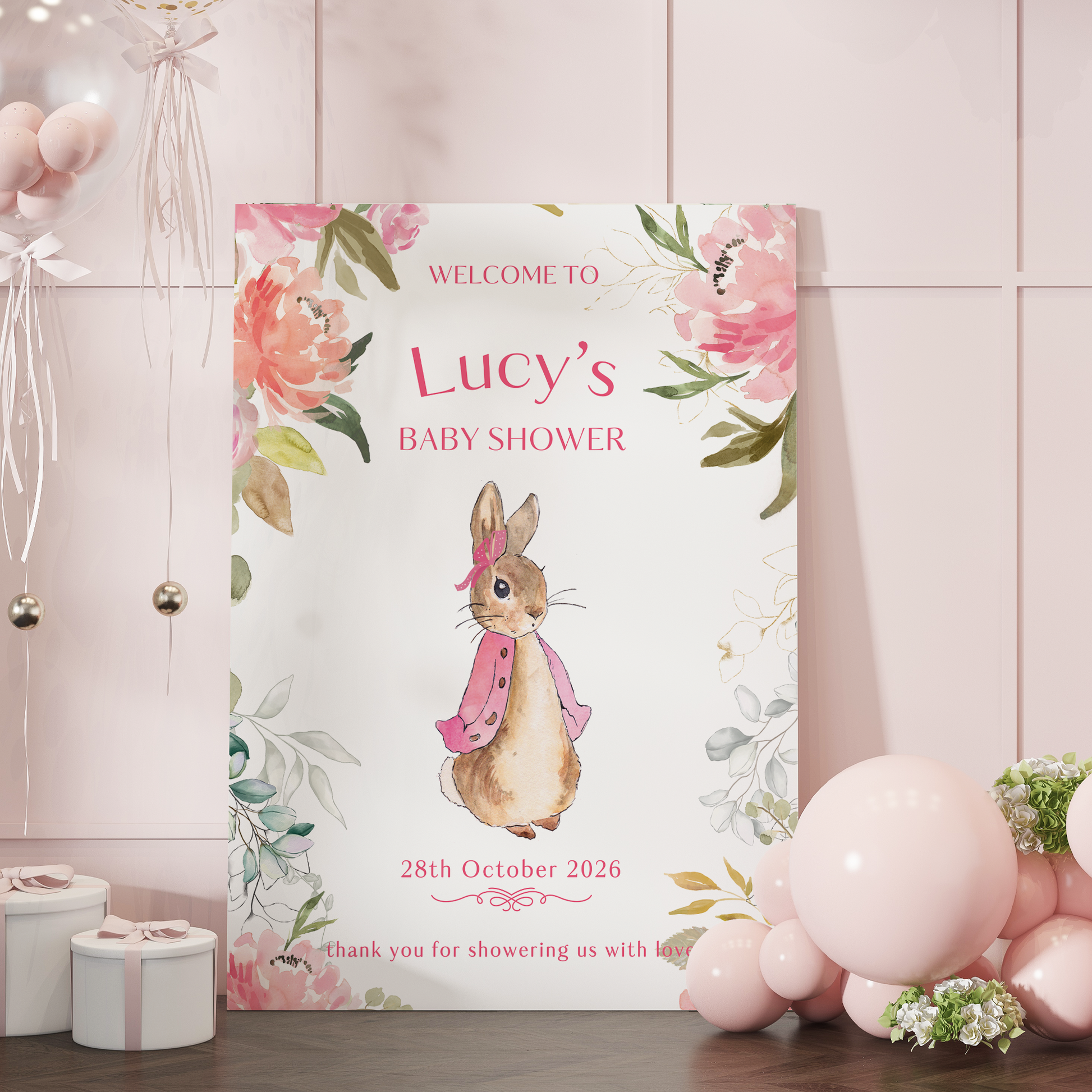 This Pink Peter Rabbit baby shower welcome sign makes a wonderful addition to your decor at the baby shower table. Any guest of honour will appreciate this party sign as they welcome their precious bundle into the world.