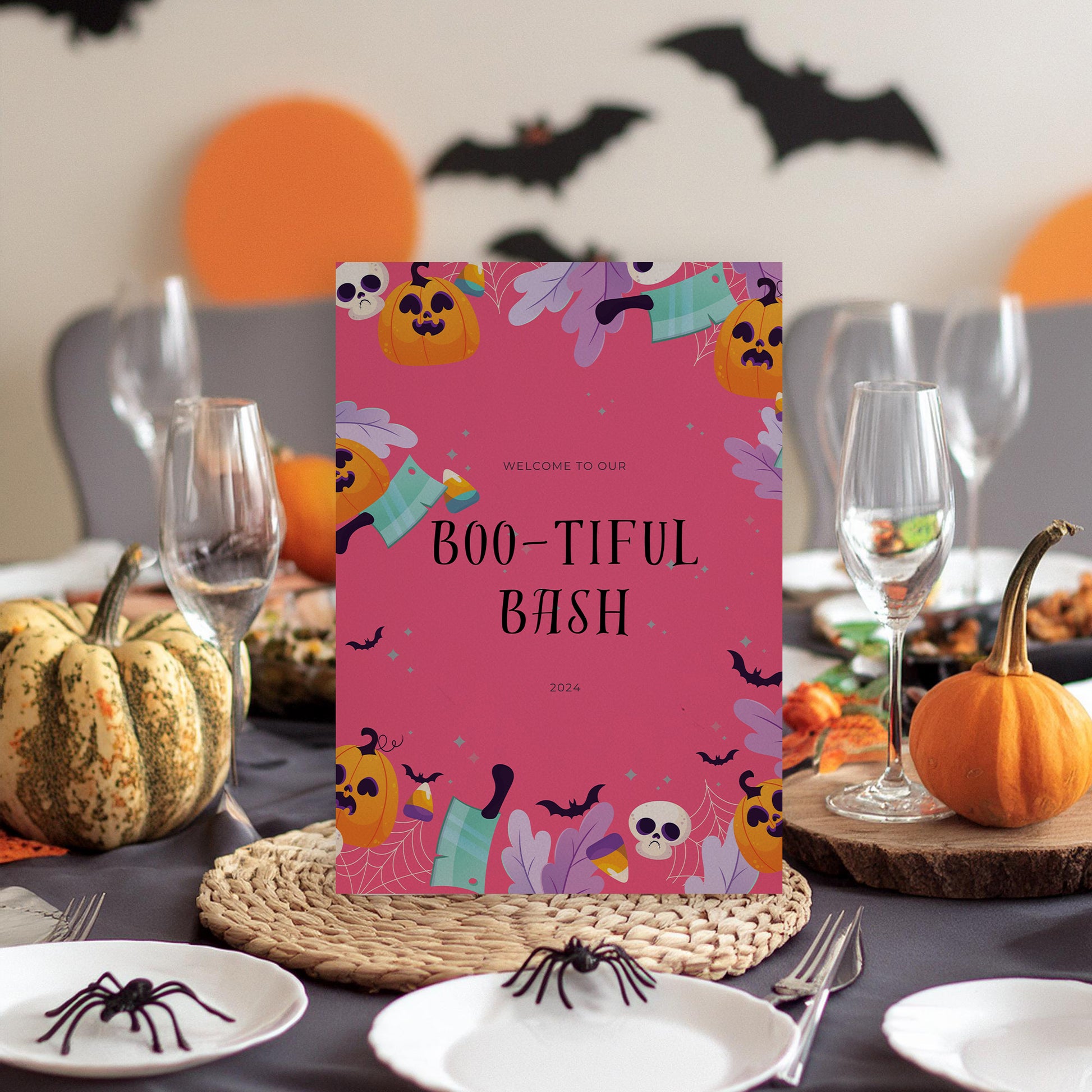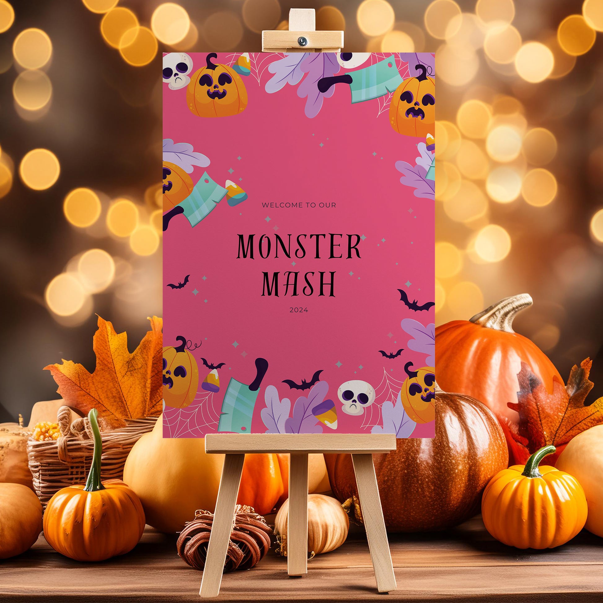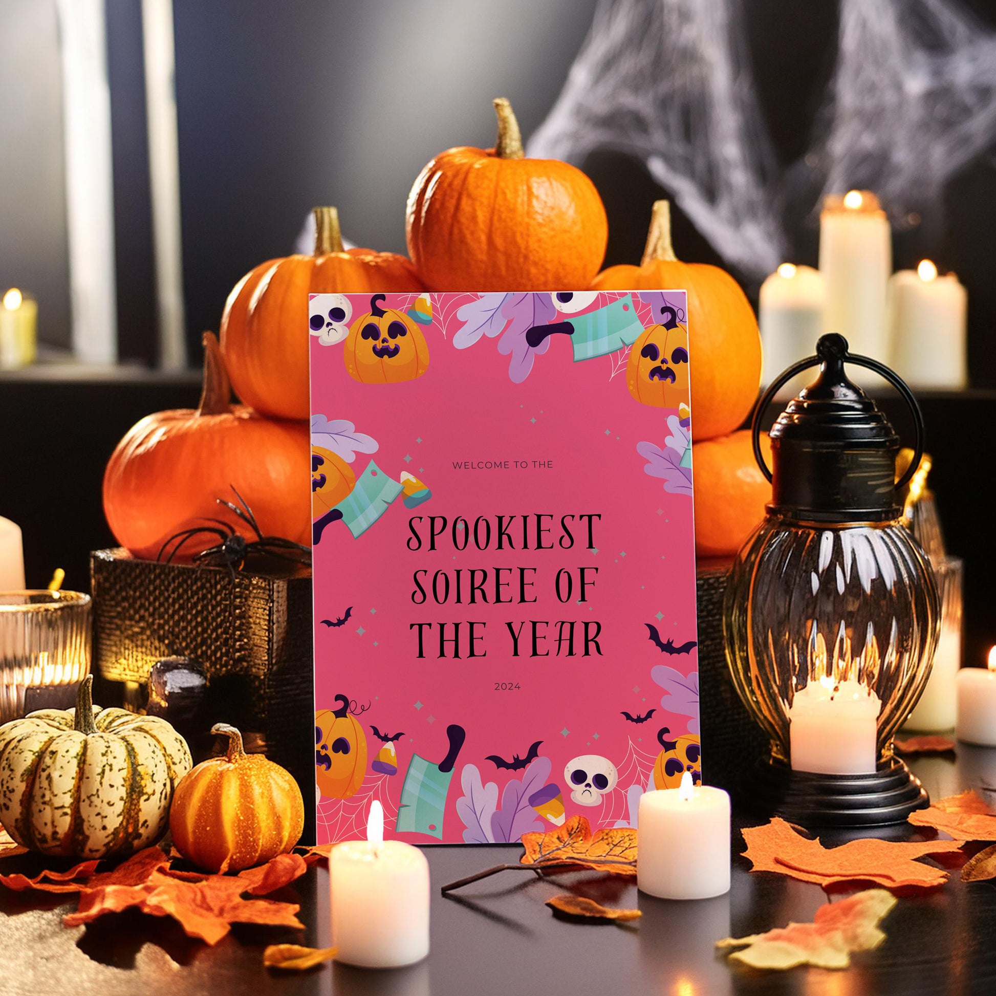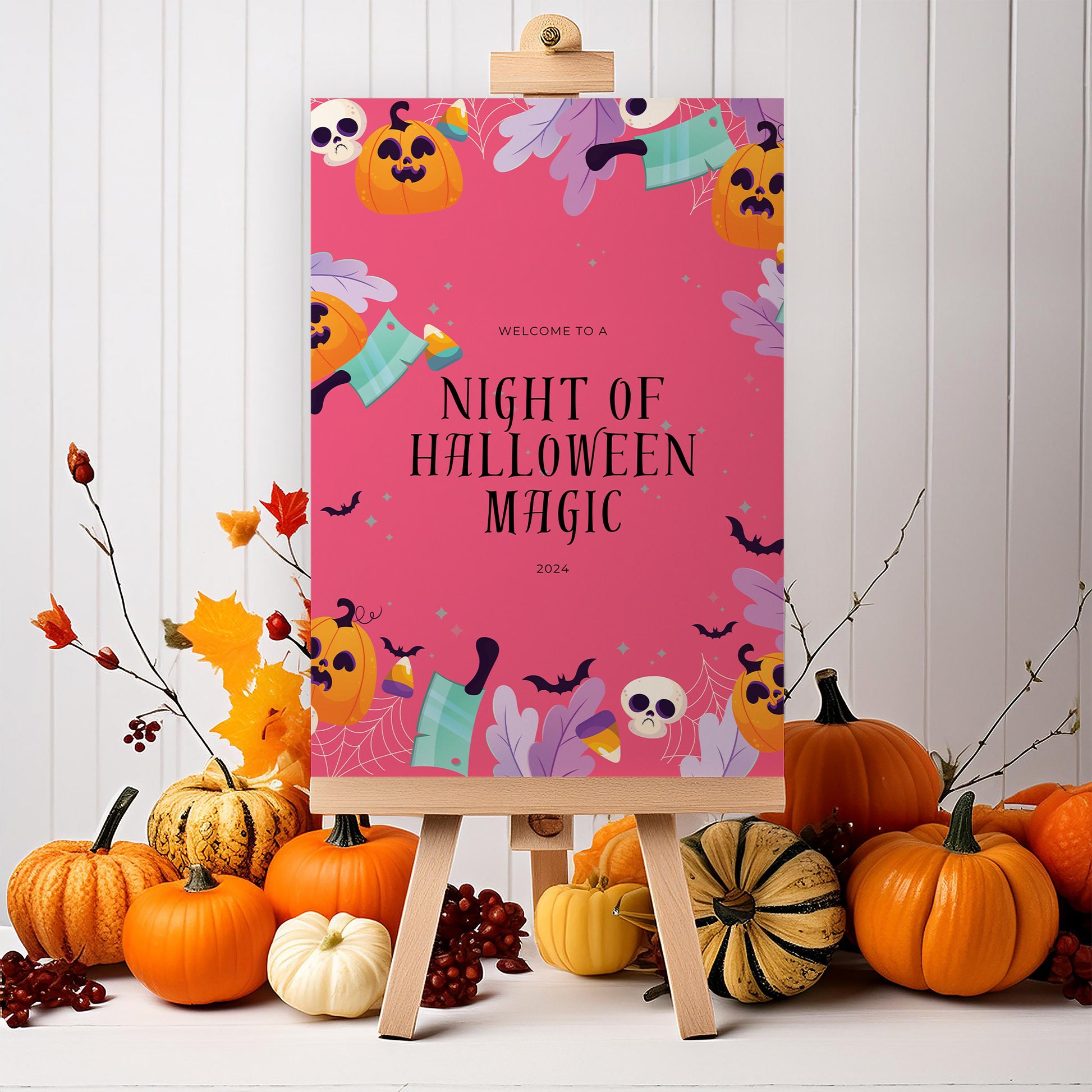 Step into a whimsical world of enchantment with our Pumpkin Halloween Party Sign. Against a background of vibrant pink, this captivating sign brings together the warmth of pumpkin spice and the allure of a magical carnival, promising a Halloween celebration like no other.
