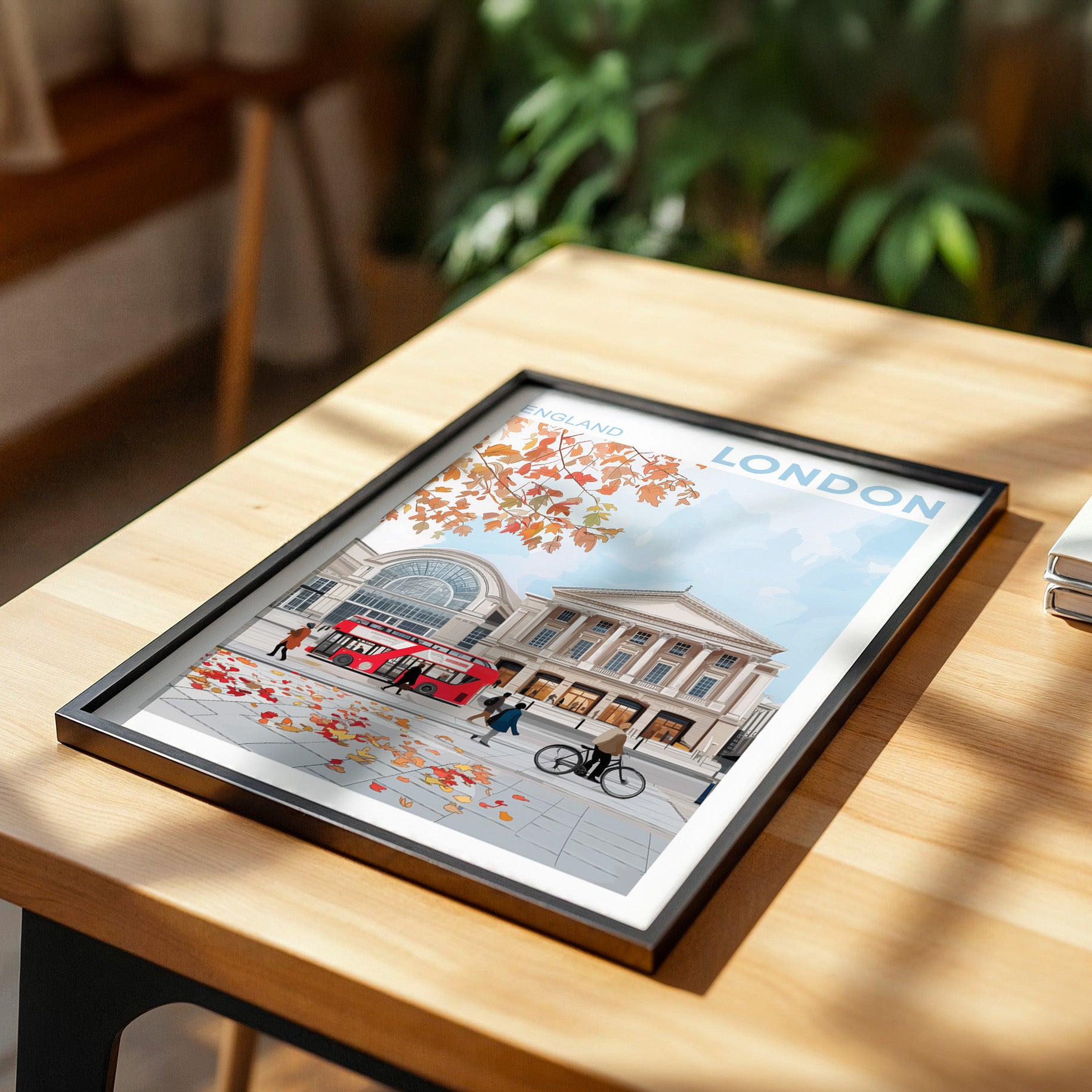 Celebrate one of London’s most elegant landmarks with this beautiful Royal Opera House poster. This London art print captures the grandeur of the Royal Opera House in Covent Garden, framed by autumn leaves, crisp blue skies, and the city’s famous red double-decker bus passing by.