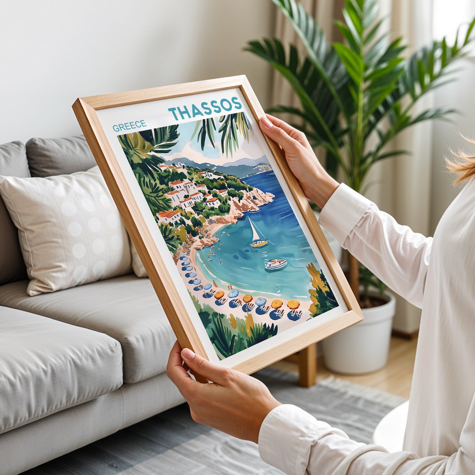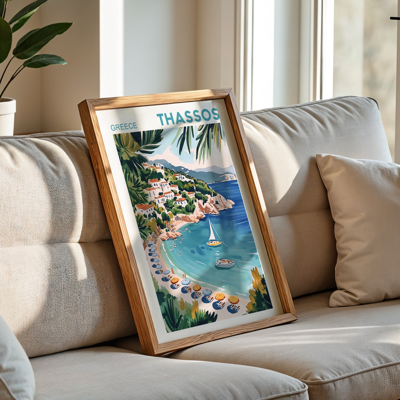 Illustrated in a vibrant painterly style, this Thassos wall art radiates warmth, light, and Mediterranean calm. It’s ideal for bringing a sense of sunshine and escape into your living space, bedroom, or coastal home décor.