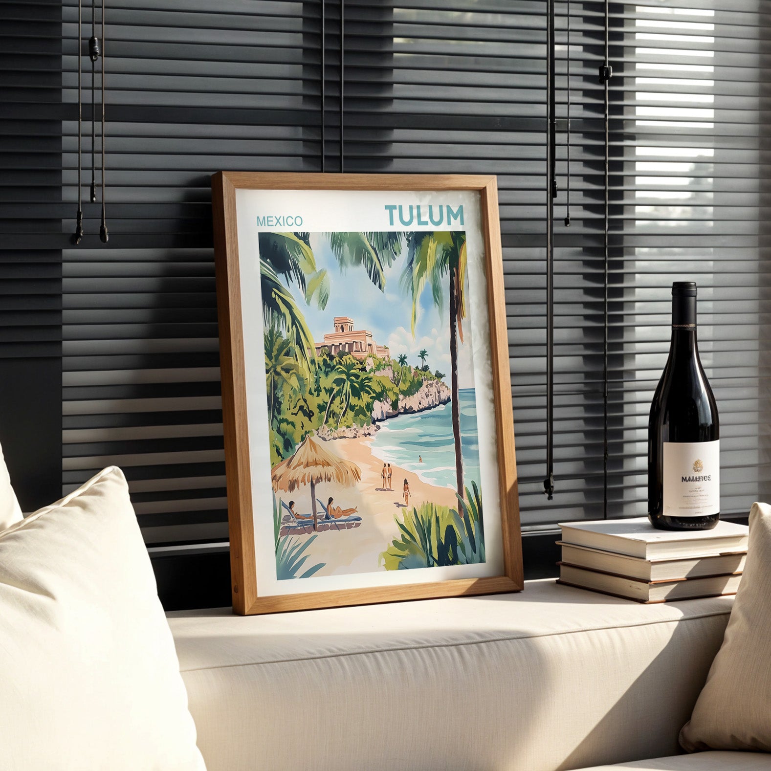 Illustrated in a warm painterly style, this Tulum wall art radiates calm and tropical charm — perfect for creating a relaxed, coastal atmosphere in your bedroom, living room, or holiday home.