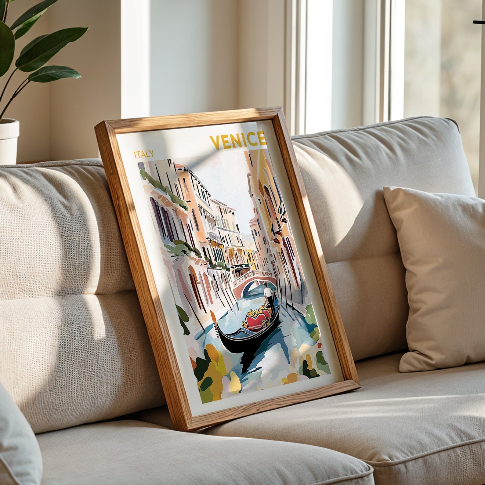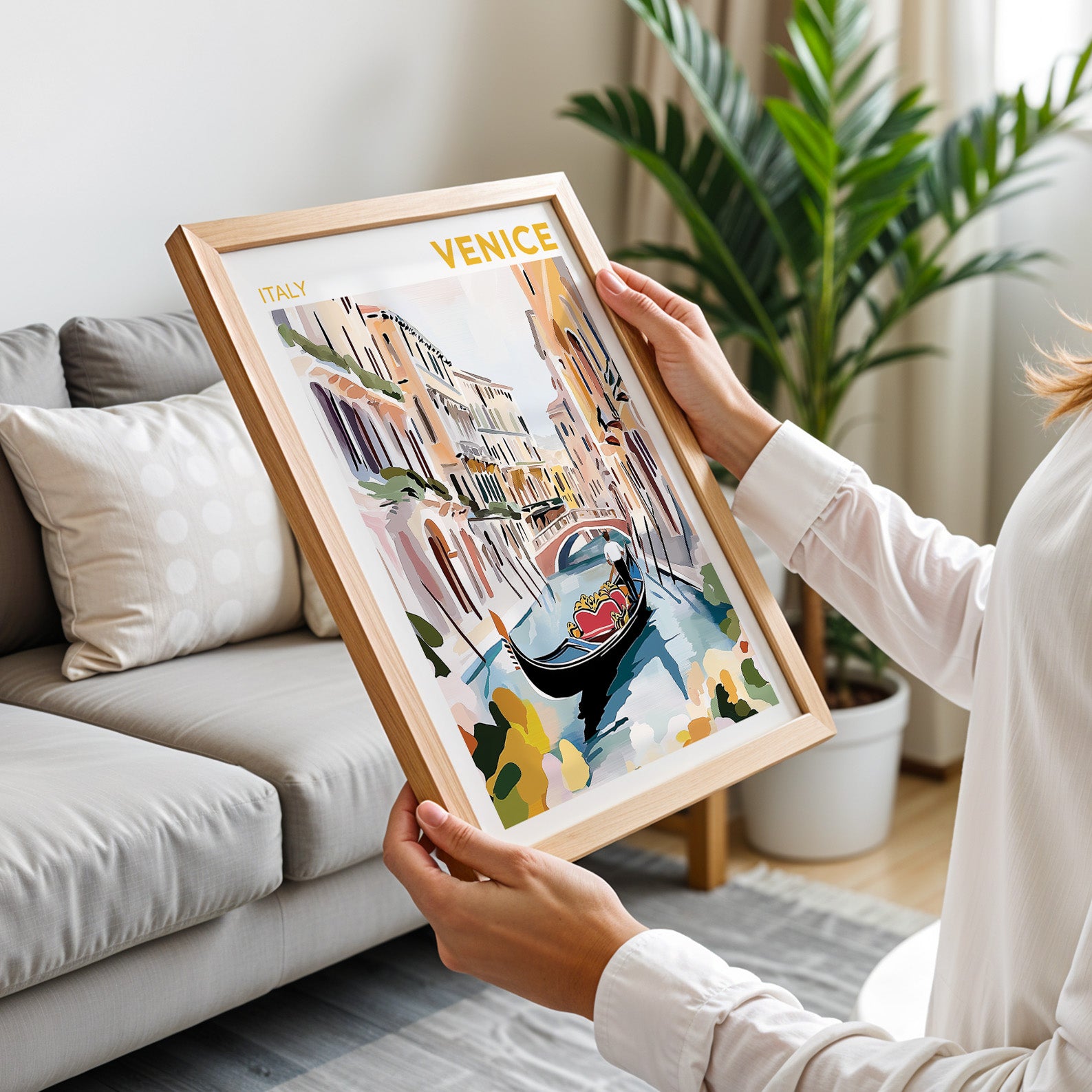 Capture the romance of the floating city with this elegant Venice poster. This Italy art print depicts the winding canals, graceful gondolas, and pastel-hued palazzos that make Venice one of the world’s most enchanting destinations.