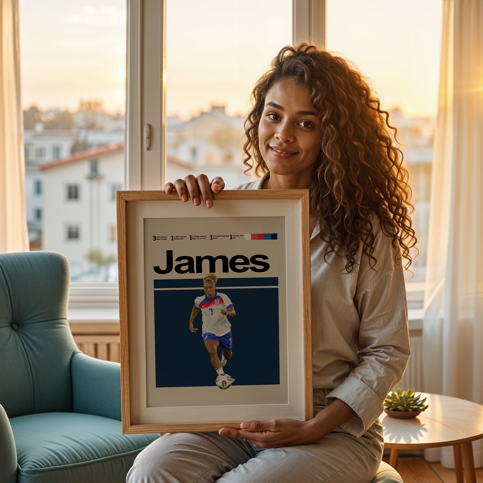 Designed in a clean, minimalist art style, this print captures James’ power, flair, and creativity for both Chelsea and the England Lionesses.